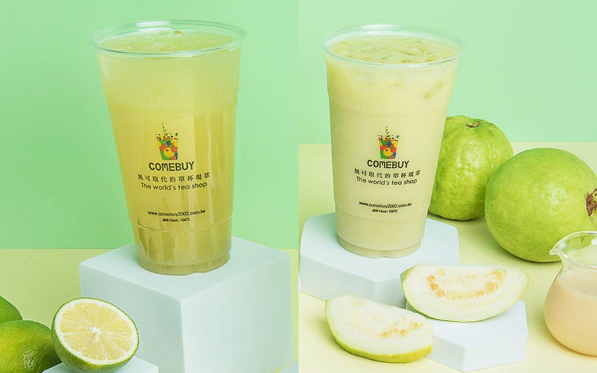 COMEBUY經典熱銷十年的「芭樂檸檬綠」,以土芭樂汁搭配檸檬、茉莉綠茶是最完美結合,其層次帶有土芭樂特有的甘甜,喉韻更迴繞茶葉清香。「芭樂多多」帶有土芭樂原本的輕盈青澀口感,加上養樂多活菌發酵乳,酸甜風味交織,每年夏天都好值得來一杯!