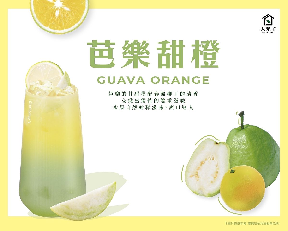 大苑子嚴選新鮮芭樂搭配香甜柳橙打造「芭樂甜橙」,將芭樂的甘甜加上柳橙的清香,交織出清甜不膩的獨特風味,每一口都能感受到水果的自然風味。
