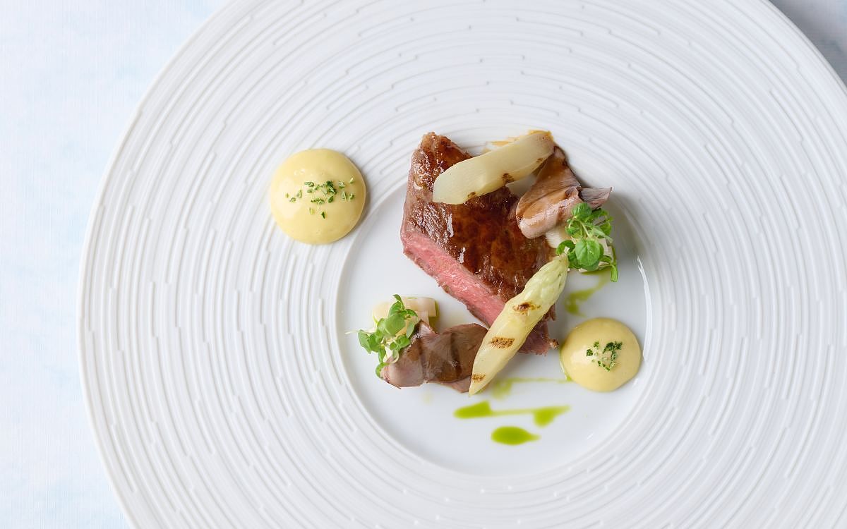 圖片來源:le beaujour飽滿風味於主餐純種草飼澳洲和牛達到巔峰,澳洲純種老和牛由於飼養期長,味道甘甜、香氣濃馥,從而得名。特以炭火味的火烤油菜葉製作油菜泥,與老和牛濃重的陳年香氣相襯。蘑菇則鑲有洋蔥、茴香與炒酥牛絞肉,以鹹香濃郁帶有堅果香氣的Gruyère與Comté Cheese,製成乳酪慕斯覆蓋其上,再灑落茴香籽等乾香料,強化辛香味。佐以馬鈴薯千層、蘑菇泥,提升菜餚層次,最後淋上茴香油、牛肉醬汁,點綴新鮮茴香碎,妝點一抹青草氣息。