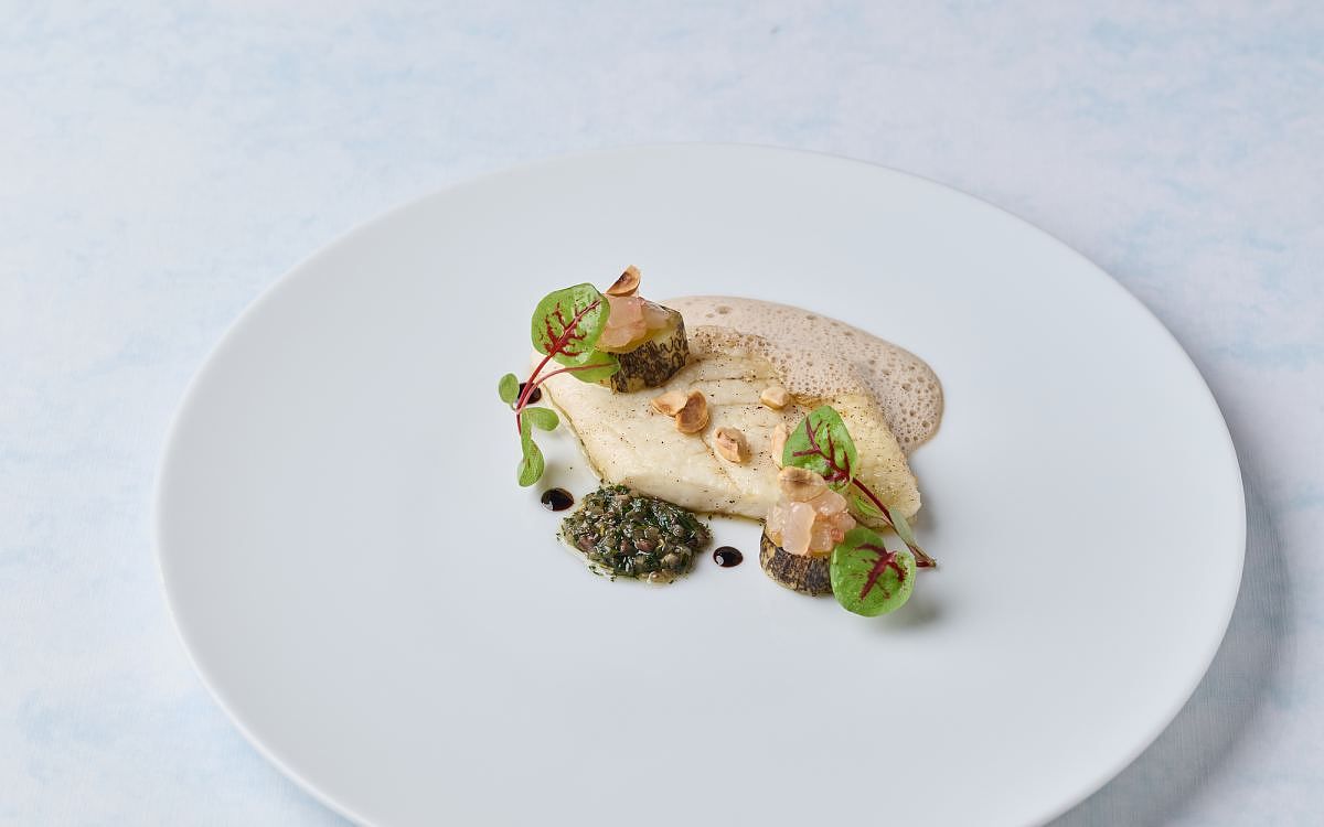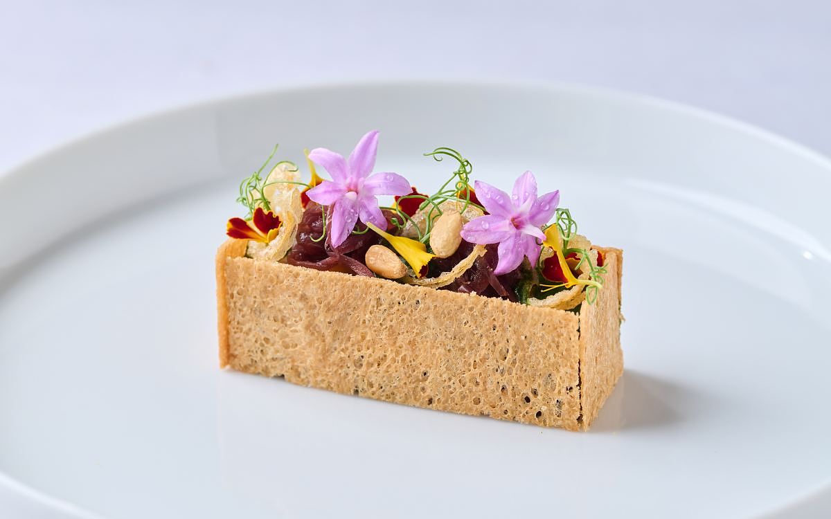 圖片來源:le beaujour開胃小點三品巧心的設定仿如敲打琴鍵漸次擊醒味蕾。首先以鹹蛤香緹開場,靈感源自臺式醃鹹蜆,蛤蠣汆燙後入薑、蒜、香茅去腥炒香,拌進法式香艾酒製成香緹奶油,灑落二荊條辣椒粉和紫蘇花,沁心中帶辛鹹,尾韻竄升紫蘇幽香,清新回甘;第二重為巧克力脆片,製作脆片Taco時摻和些許可可粉,創造苦甜風味,填進法式酸奶、蝦夷蔥,並放入西班牙臘腸、烤紅黃椒丁、番茄丁、洋蔥製成的巴斯克風格塔塔,烤甜椒鮮香與可可甘苦相佐,迴盪獨特異國情調。第三重為普羅旺斯香草酥餅,Pita餅貌似承托綠寶石的小巧戒枕,典雅油綠,上方為西芹、羅勒等香草製作之奶油醬;Pita餅又稱口袋餅,烘烤時因蒸汽膨脹形若口袋,於此空間填充茄泥魚子醬與Ricotta cheese,一口賞閱南法夏日風景。