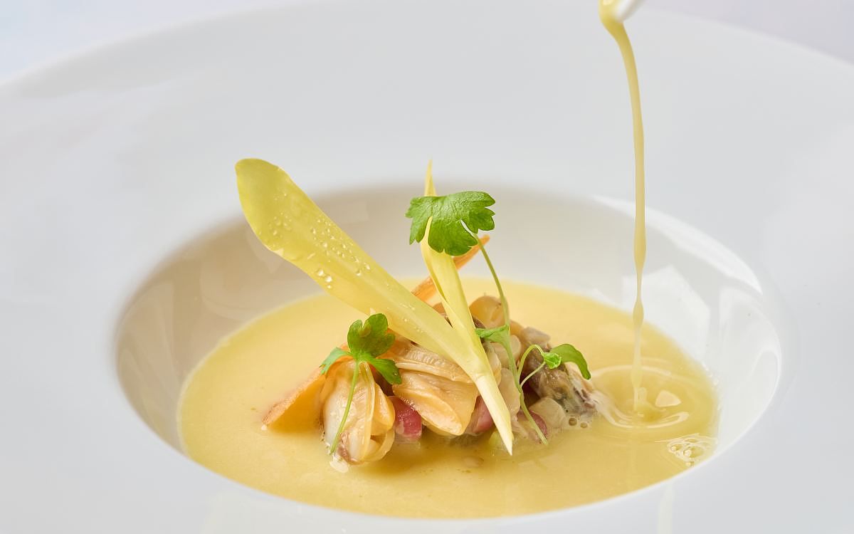 圖片來源:le beaujour玉米湯選用臺灣本地雙色糯米玉米,因色澤粉紫交錯亦稱胭脂玉米,其表皮彈牙、內裡香糯,口感隨顏色深淺而有軟硬變化。以奶油炒香洋蔥、西芹丁與雞高湯拌炒玉米粒至收汁,使玉米粒飽味豐,加入乳酪、法式酸奶,最末淋上反覆過濾的玉米清湯。吸滿高湯的玉米晶瑩具嚼感,熟成 12 個月的康堤乳酪層疊醇厚鹹香,季節盛產的海瓜子肥美鮮甜,賦予玉米湯另一層礦物鹹味,香甜玉米脆餅烘托湯品絲滑,點綴玉米苗、芹菜苗,滋味溫潤、馨香可人。