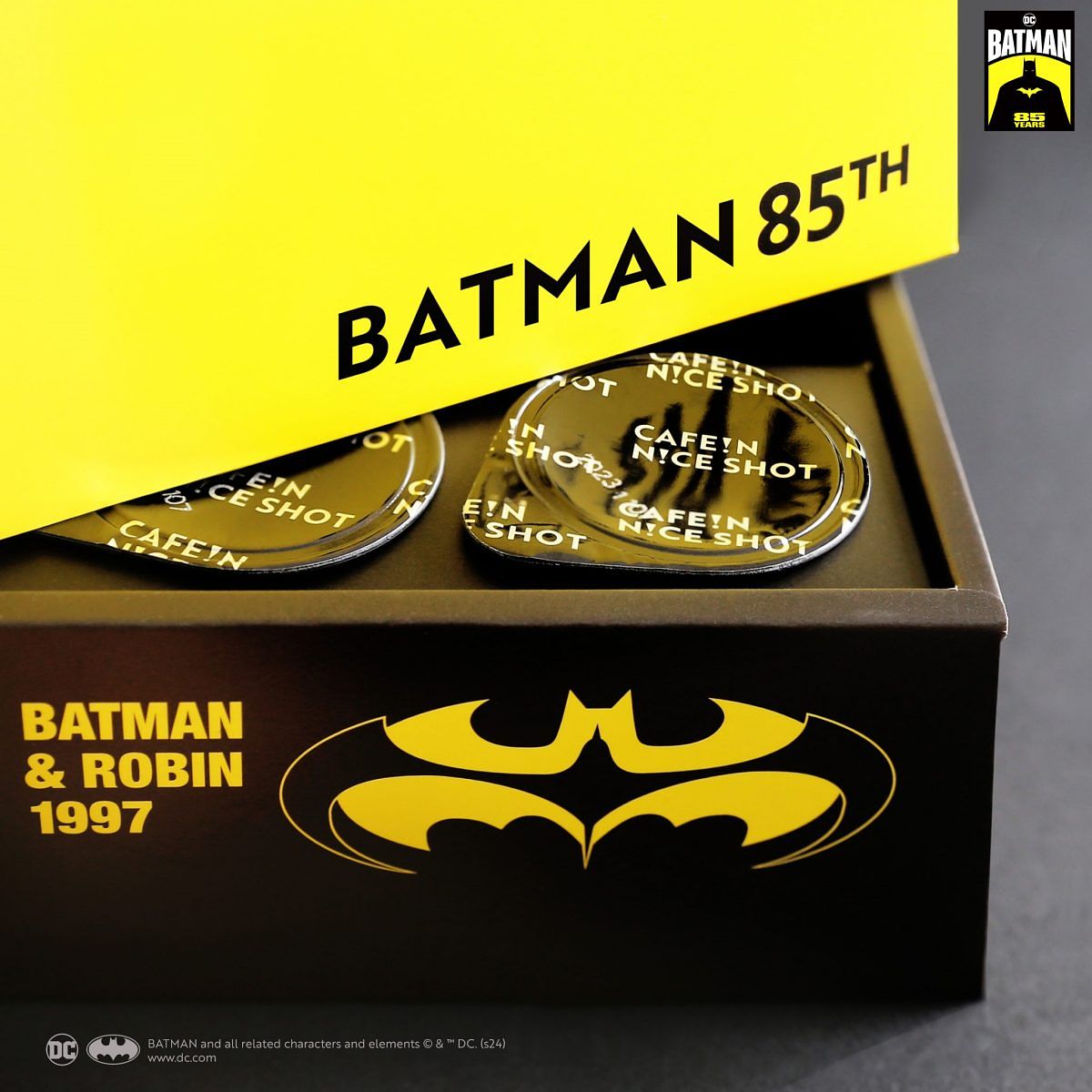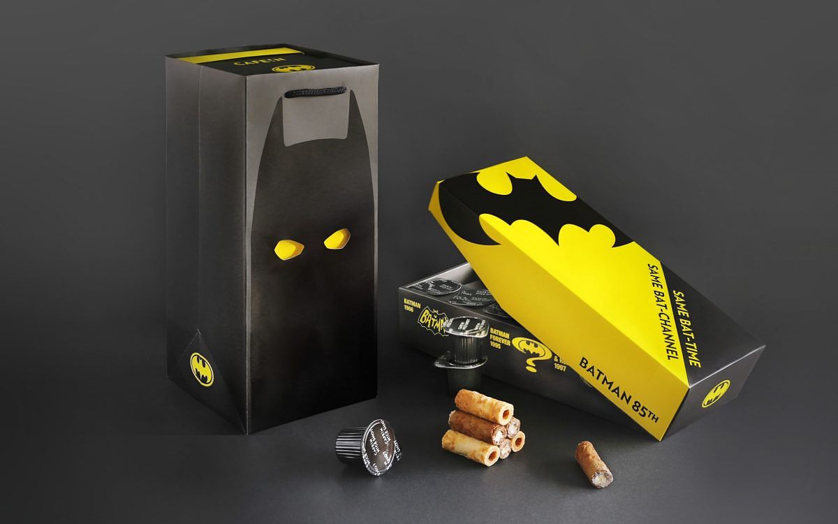 CAFE!N攜⼿華納兄弟推出「BATMAN 85th 極萃球蛋捲禮盒」,⼀次集結六款經典年份的BATMAN蝙蝠俠圖素,更設計專屬雙⾯印刷紙袋,整體外形設計處處充滿細節與驚喜。禮盒內有CAFE!N明星商品「N!CE SHOT極萃咖啡球」,每⼀顆極萃咖啡球都等於⼀份現煮濃縮咖啡,伴點則選⽤以12層酥脆⼯法製成的頂級⼿作法國奶油蛋捲,推出法式奶油原味與咖啡焙香奶酥兩種風味。