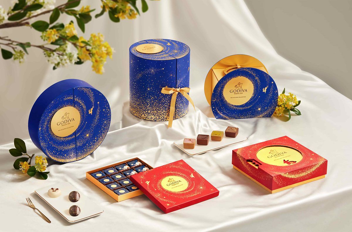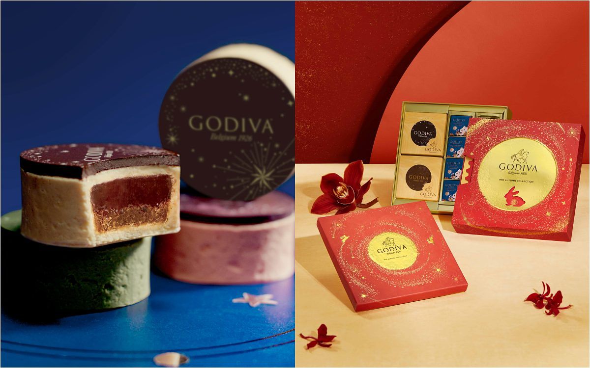 比利時皇室御用巧克力品牌GODIVA,創新推出2024年中秋限定巧克力月餅,由巧克力大師 Sébastien Bauer 於歐洲經典甜點中獲得啟發,將西方精巧建築美學融入中式傳統糕餅所打造,推出四款限定口味:黑芝麻鳳梨牛奶、抹茶柑橘、覆盆莓玫瑰、黑松露杏桃。頂部覆蓋頂級巧克力片,搭配點點星河與玉兔、桂花等中秋元素圖案,外層以鬆軟酥脆的塔殼包裹調味果餡與雙層巧克力夾心,巧妙搭配中式風格食材:如黑芝麻、鳳梨等,以香濃的巧克力滋味與清新水果餡交織。
