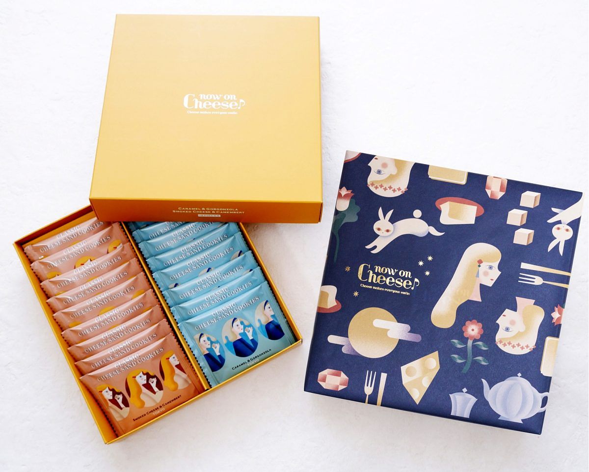 「Now on Cheese♪」集結「煙燻起司&卡門貝爾起司夾心餅乾」及「焦糖&古岡左拉起司夾心餅乾」兩大品項,推出雙口味組合款式「中秋限定綜合禮盒」。「煙燻起司&卡門貝爾起司夾心餅乾」酥脆的奶油脆餅包覆著由煙燻起司及卡門貝爾起司所製成白巧克力起司夾心內餡,煙燻香氣與濃郁的奶香交織融合,口感鹹香風味鮮明,十分迷人。「焦糖&古岡左拉起司夾心餅乾」焦糖風味的餅乾包覆著由古岡左拉起司製成白巧克力夾心內餡,餅乾脆口夾心絲滑,鹹、甜、香多重味蕾恰到好處,是一款口味獨特的起司餅乾。