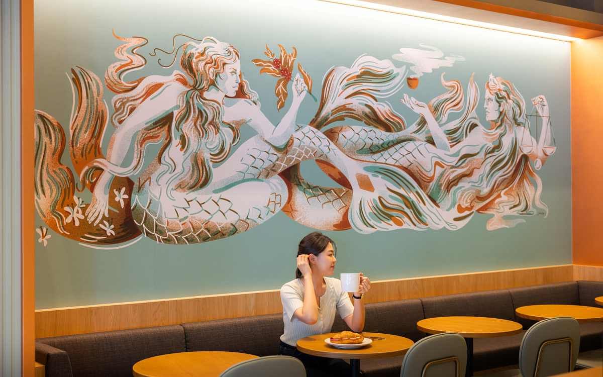 圖片來源:星巴克門市藝術牆面是以兩位女神在歡慶星巴克成立超過50週年,一位年輕的女神拿著一根咖啡枝象徵著星巴克的開始,而另一位聰明的女神拿著一杯煮好的咖啡和天秤象徵著星巴克的事業。2024年也慶祝著台南400建城的歷史,而星巴克首府門市特別規劃以星巴克50週年所設計的藝術牆面,展現出為台南這一片土地所留下的重要記憶。