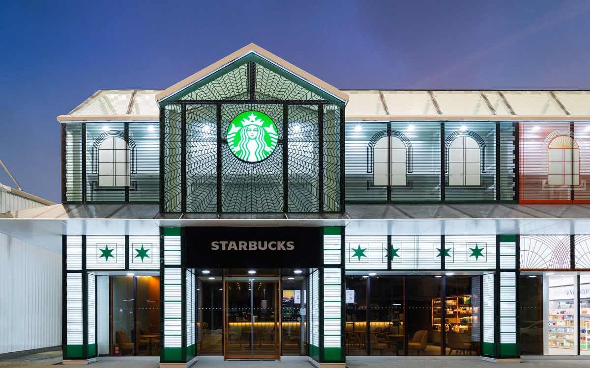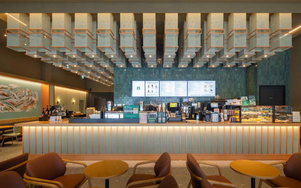 圖片來源:星巴克門市室內設計的靈感來自於華麗的透明結晶玻璃塊立面裝飾其外部,反映了鄰里充滿活力的能量。它將玻璃磚的透明和輕盈的概念從外部引入內部空間,創造出令人印象深刻的天花板特徵,模仿玻璃塊立面的複雜圖案來展示吧台。透過金屬網半透明材料的使用讓光線在空間中舞動和玩耍,營造出一種開放和通透的感覺,既清新又充滿活力,再搭配植物壁畫藝術作品,為空間帶來自然和寧靜的感覺。