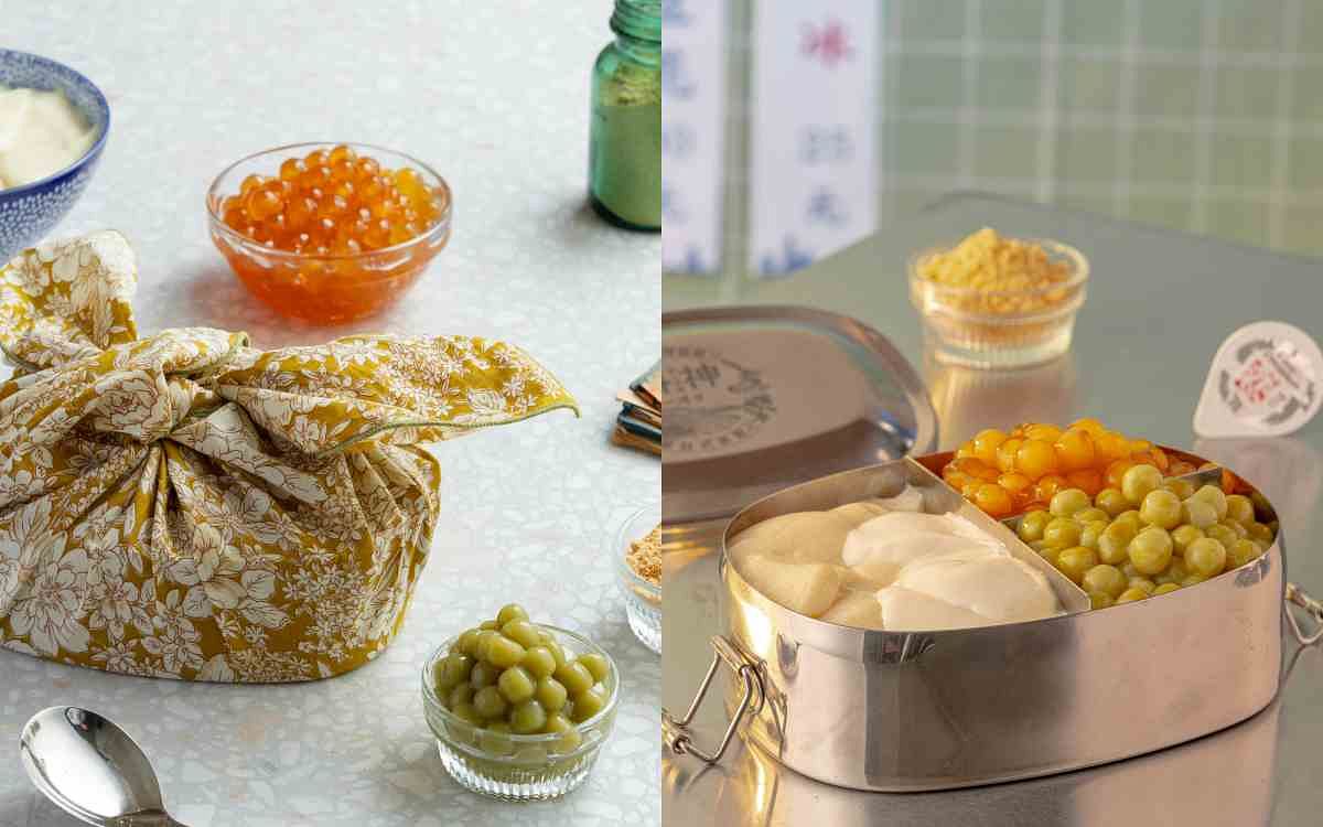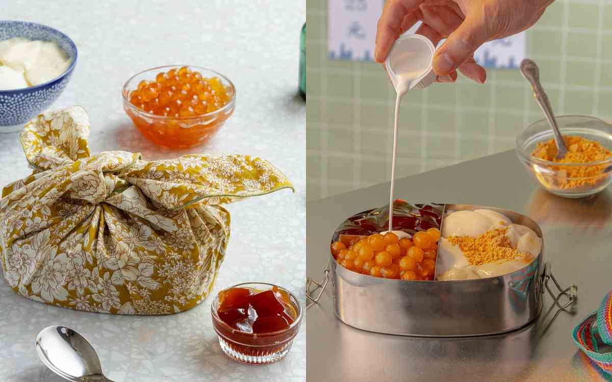 圖片來源:一沐日 以配料為契機,12週年慶特別推出「經典料神便當盒」與「珍藏料神便當盒」兩款產品設計,把奶酪請回來作限時回歸佳賓,加入豆花為便當基底,還可選配草仔粿加嫩仙草的草草組合、或是粉粿加粉圓的粉粉組合,還有草仔粿加粉圓的圓圓組合口味,每一盒都會再附上逮丸麵茶粉與奶油球來增加濃郁口感,不論是單吃當點心,還是搭配茶飲享用,都能在每一口的咀嚼中享受到甜在心裡的幸福滋味。
