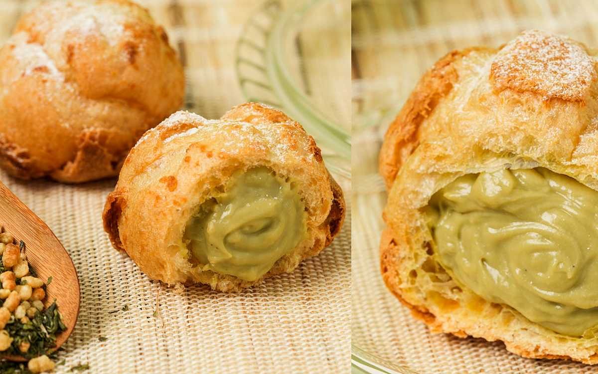 圖片來源:beard papa’s 第❷名「玄米茶歐蕾泡芙」($80元起/顆,限定門市販售):強勢崛起的全新口味!將玄米綠茶拌入beard papa's經典卡士達與優質鮮奶油,製成「玄米茶歐蕾內餡」。一口咬下,清新的奶綠色內餡令人心曠神怡,接著品嘗到綠茶的濃郁滋味,並徜徉在玄米獨特的香氣之中,帶來別具一格的夏日風味。