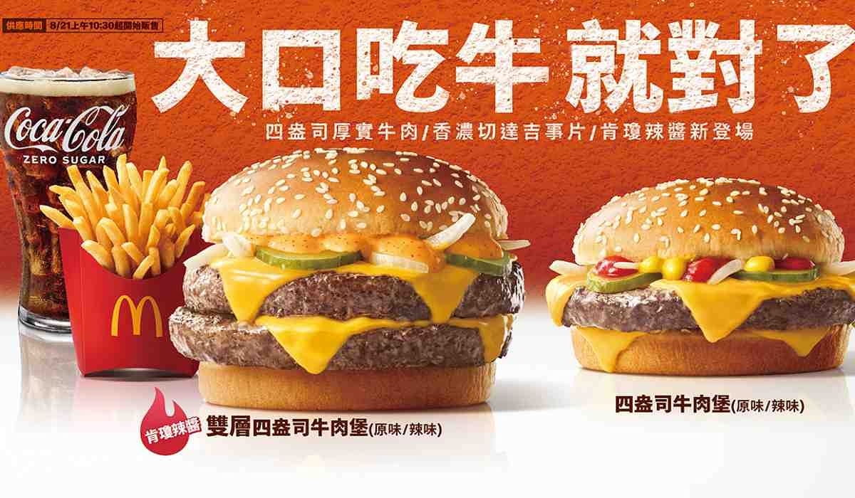 愛吃美式風味牛肉堡的人快看!台灣麥當勞「辣味四盎司牛肉堡」與「辣味雙層四盎司牛肉堡」自8月21日起至9月17日(或售完為止)重磅登場!以經典「四盎司牛肉堡」與「雙層四盎司牛肉堡」,首次搭配超人氣「肯瓊醬」,以強烈香氣、尾韻微辣的多重風味,帶出滿滿牛肉味及濃郁香辣感,讓饕客大飽口福!