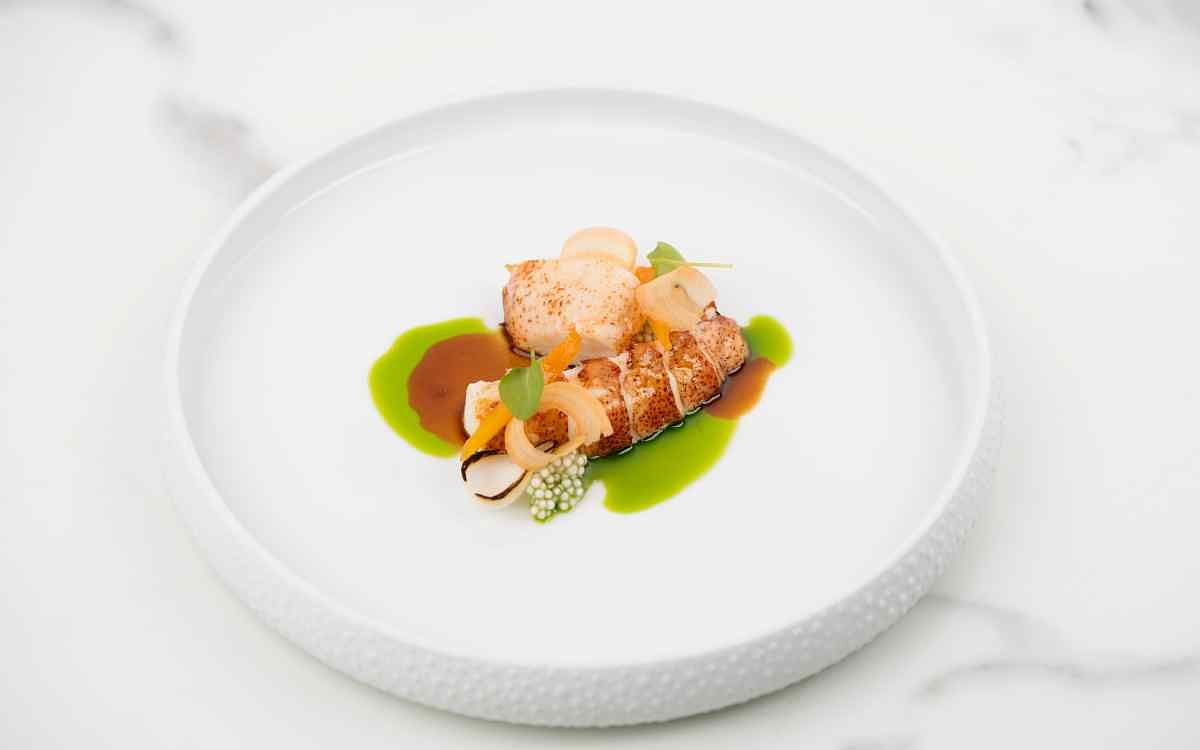 《緬因龍蝦 迷你蘿蔔 咖哩》選用緬因龍蝦,搭配蔥油西谷米,增添豐富的口感,主廚以咖哩及多種香料調製醬汁,醬底採用以魚為主軸的法式澄清湯為基底,鮮味十足的咖哩醬汁與龍蝦的鮮甜相得益彰,讓整道菜品在味覺上展現出豐富的深度與層次。