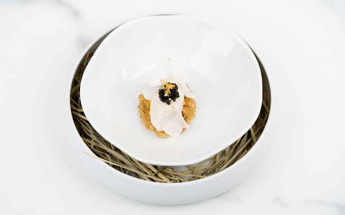 圖片來源:MiraWan Eatery 《法國魚子醬 酸奶 綠豆蔻》以純白迷人的香水銀耳為主角,帶有淡雅的茉莉花香氣,銀耳下方鋪著烤過的無花果拌上草本食材,周圍以清新的甜白酒茉莉木耳凍襯托,提升了味覺的清爽感,與濃郁的山羊乳酪冰淇淋相互映襯,形成絕妙的平衡,最後,撒上些許綠豆蔻粉,增添風味的層次。