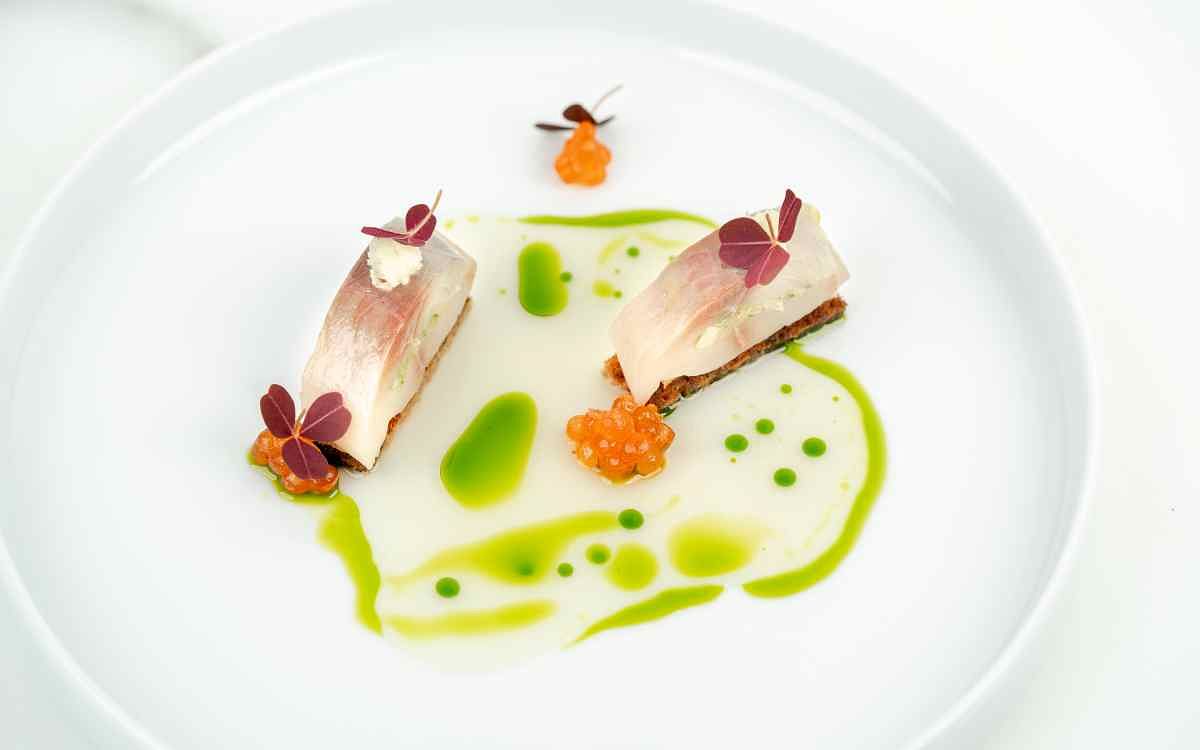 圖片來源:MiraWan Eatery 與森林相呼應的香料是不可或缺的元素,《日本鯖魚 鮭魚卵 香料脆片》此道的亮點是肉桂與陳皮製成的香料脆片,香料的獨特香氣與層次恰到好處地與選用的日本鯖魚菲力相互融合,鯖魚中間鋪上以法式傳統手法悶煮的法國韭蔥,全程不使用任何油或水,使食材的自然鮮味得以保存。最後,淋上微酸的白椪醋,香料脆片的風味與鯖魚的鮮美相互呼應,入口後舌尖迸發出意想不到的驚艷滋味。