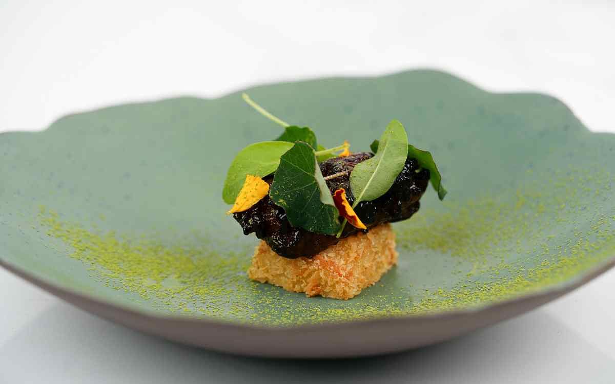圖片來源:MiraWan Eatery 此道菜品充滿森林的木質調性,《澳洲小牛胸腺 火烤綠蘆筍 綜合香草》首先映入眼簾的是香草苗、綠酸模與金蓮葉,呈現出自然的綠意,藏在底下的是澳洲小牛胸腺,經過牛奶浸泡並靜置一晚去腥而後低溫烹調至完美嫩度,而特製刷醬由雞高湯與台南特產冬瓜糖熬製而成,反覆刷烤入味,讓小牛胸腺更添風味,搭配以雞高湯熬煮的冬瓜佐以法式芥末醬酥炸,最後以黑胡椒作為點綴,為菜品注入濃厚的木質調香氣,讓人陶醉其中。