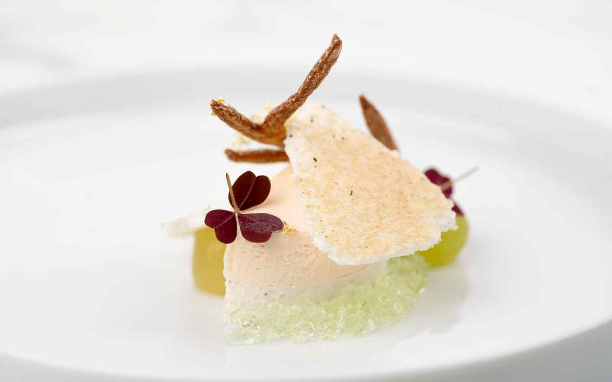 圖片來源:MiraWan Eatery 除此之外,Tony 本次研發的主甜點「香檳白桃優格乳酪慕斯」,是以夏日蔚藍的白色雲朵為靈感,白巧克力淋面下,層層疊加草莓白桃奶餡、香檳白桃凍及優格乳酪慕斯,綴以白酒蜂蜜凍與時令新鮮水果,整體呈現出白雲般的輕盈質感與清新風味。