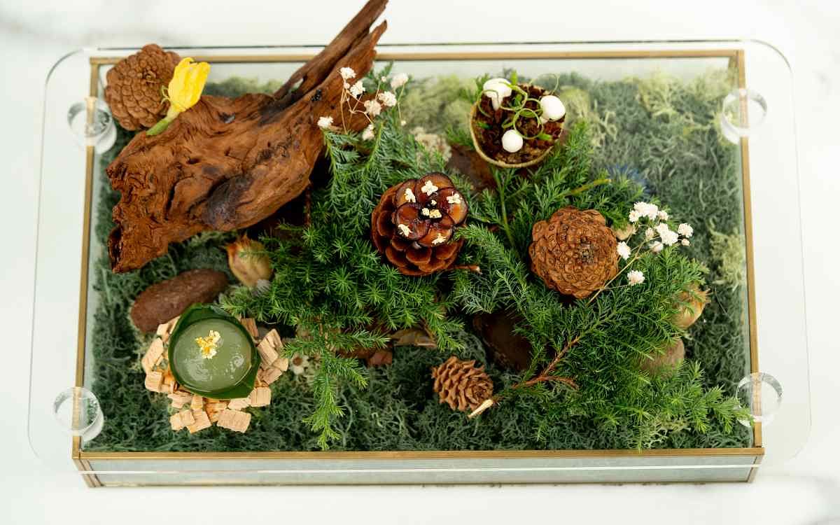 圖片來源:MiraWan Eatery 行政主廚Josh提到,每次於MiraWan出餐時,透過餐廳的落地窗便可見到象山的壯麗景致,這次他將「森林與山」的元素融入料理,展現出夏日清爽的氛圍,更挑戰選用不同以往的食材,帶領賓客透過味覺和視覺雙重感受來呈現他對山的想像,一同探尋他心目中的森林之境。