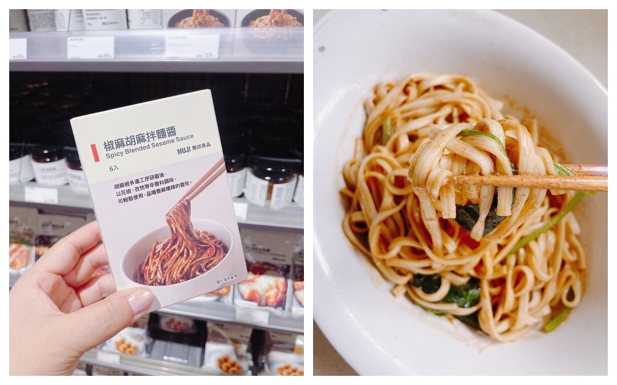 只要買一包營養麵條跟一把青菜,加上「椒麻胡麻拌麵醬(NT169、6入)」就是超好吃的乾拌麵,對了!還要再煎顆荷包蛋啦!胡麻拌麵醬雖然有原味,但吃麵就是要加辣呀!而且椒麻是剛剛好的辣,就算冷掉也很好吃!