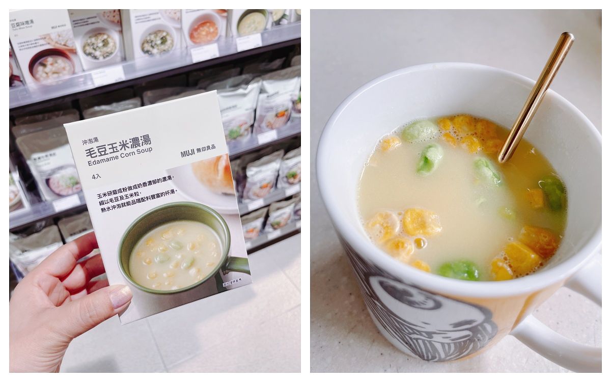 「沖泡湯(NT99/4入)」有4種口味,味噌、海帶、番茄都好,但朋友大推我“毛豆玉米濃湯”,這還真沒喝過!但有人問“毛豆味”會不會很怪!?放心!它喝起來就是香濃玉米湯,只是多加了乾燥毛豆這樣!好喝!極香極濃!