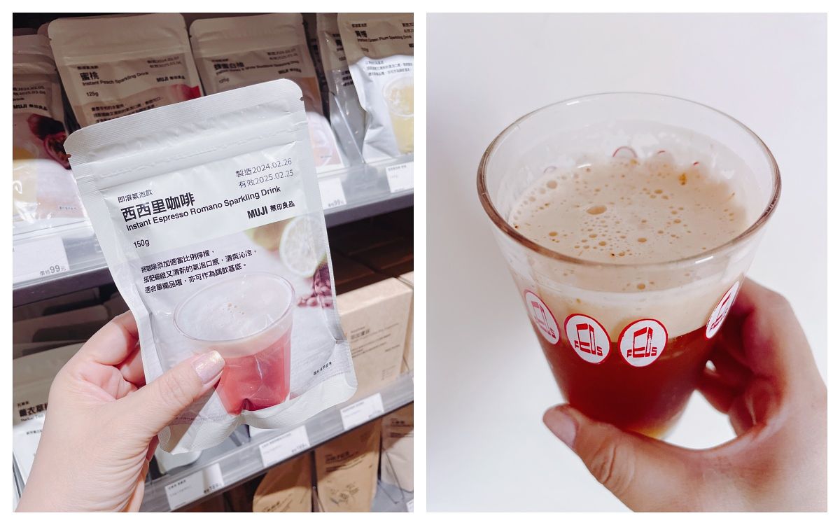 最後來到飲料區!「即溶氣泡飲(NT99)」系列有7種口味!大推“西西里咖啡”,因為沒喝過咖啡氣泡飲!口味果然很獨特,沖泡時還會一直冒泡泡,這一包可以泡個10杯,雖然咖啡味比較沒那麼濃,但冰冰喝還是很透心涼!