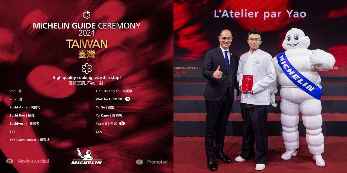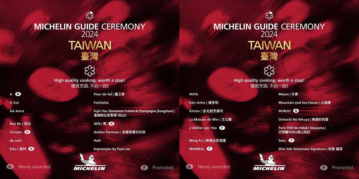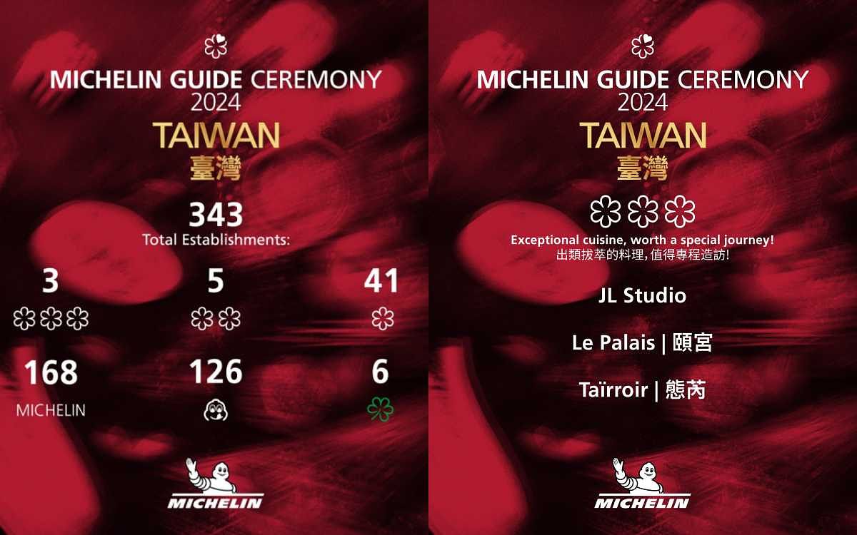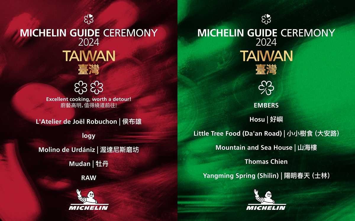 此外,連同自去年維持一星肯定的店家,目前共有41家一星餐廳(臺北30家、臺中8家、高雄3家)。二星及三星則維持與2023年的餐廳相同,5家臺北二星餐廳包括侯布雄(時尚法國菜)、logy(時尚亞洲菜)、渥達尼斯磨坊(時尚西班牙菜)、牡丹(天婦羅)、RAW(創新菜)。維持三星的餐廳包括位於臺中的JL Studio(新加坡菜、時尚菜)及位於臺北的頤宮(粵菜)、和態芮(時尚臺灣菜)。