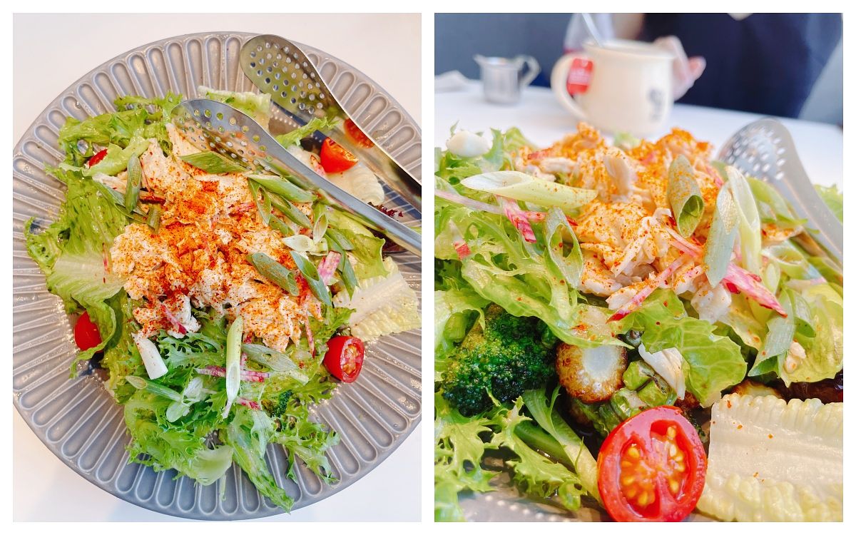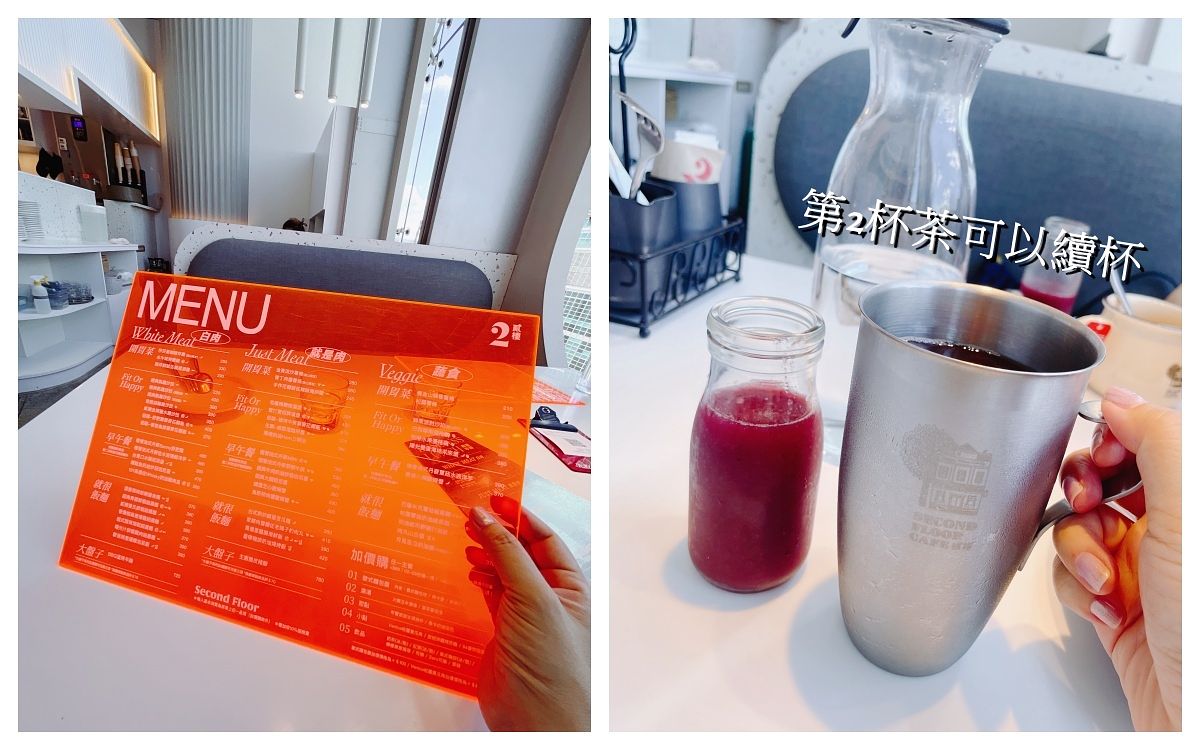 更搶眼的還有桌面瑩光色壓克力菜單!但基本上這裡得用CR code點餐。菜單分為白肉、就是肉、蔬食3類,然後是開胃菜、早午餐、沙拉、飯麵,很簡單!然後早午餐附2杯飲料,第1杯是果汁那類,第2杯為紅茶、咖啡、奶茶那類,第2杯可無限暢飲。