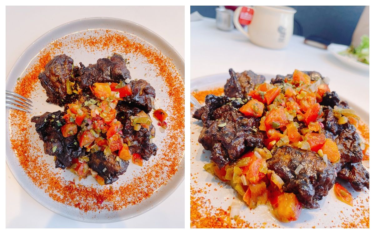 「莎莎黑咖哩炸雞」也是網上評論的必點菜,莎莎指的就是番茄丁莎莎醬料,這道是好吃的,雞肉也很多汁,但因為淋上莎莎醬…很快就不脆了,所以拍照請別拍太久,但~咖哩味呢?不會是旁邊那一圈調料粉吧?