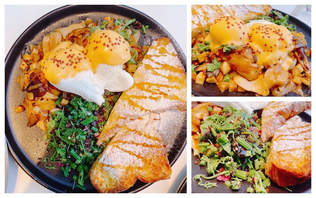 「橙香法式丹麥蕈菇水波洋芋」是蔬食區的早午餐,灑了細白糖粉的法式土司很吸引我,然後水波蛋下是滿滿的洋芋與蕈菇切小丁拌炒,另一區居然是切碎的炒龍鬚菜,使用龍鬚菜這食材很妙。