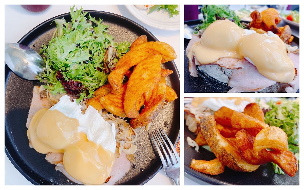 我是一定要吃肉的,這道是「經典火腿斑尼蛋」,斑尼蛋及麵包中間還鋪滿炒過的菇類,但這道料理的亮點是炸馬鈴薯,不知該如何形容它的“造型”,是有點長條狀的螺旋,超好吃的!吃得到扎實的馬鈴薯。