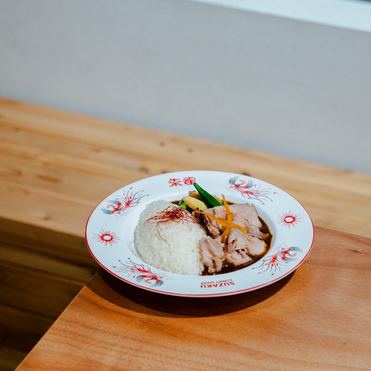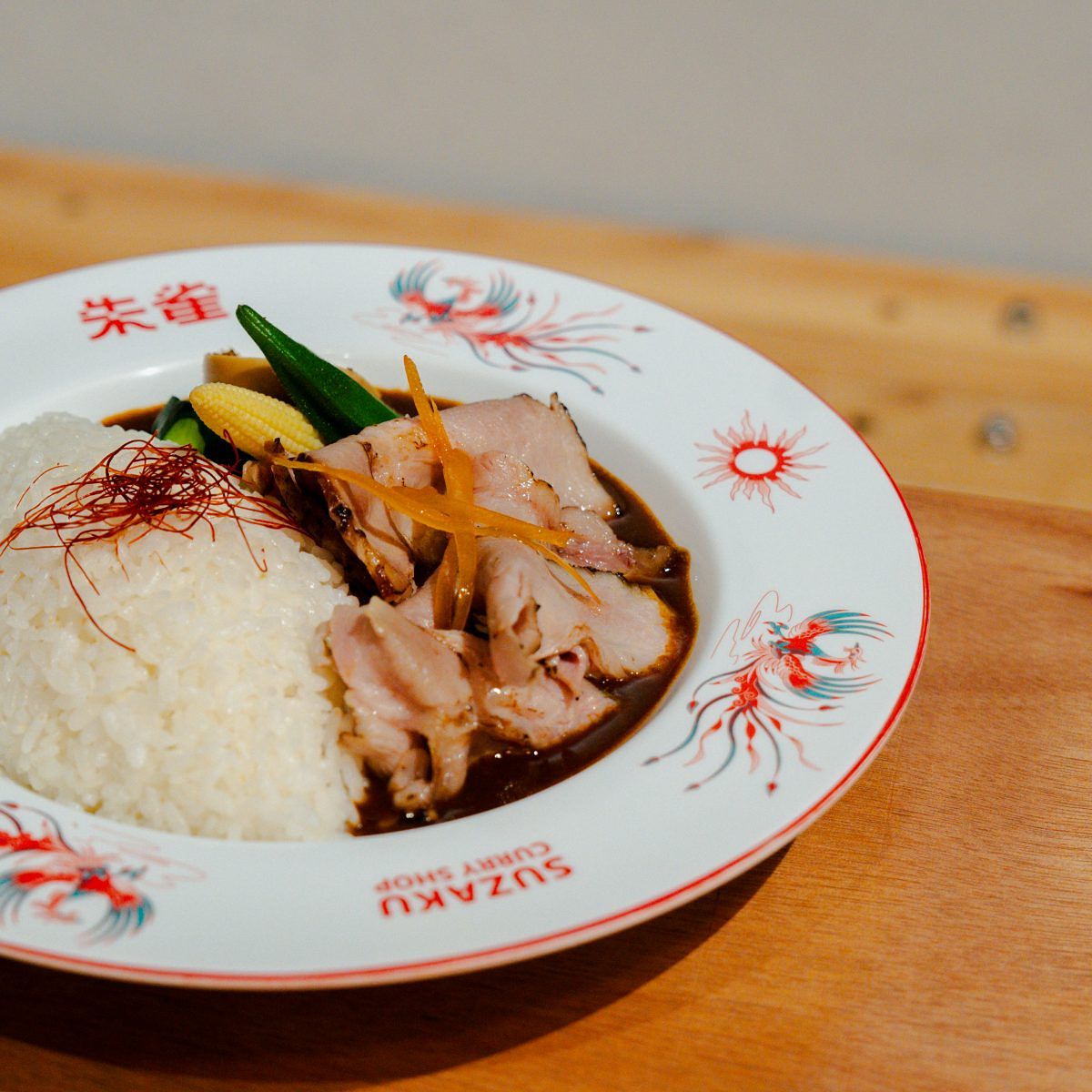 餐點以豐富多變的朱雀風味咖喱醬為主軸,「朱雀・原味甘口」將台式元素和日式歐風相融合,咖喱醬使用大量切碎的新鮮洋蔥翻炒6小時,炒至焦糖化的濃稠狀態,接著加入大量番茄、薑、蒜等複方香料熬煮,靜置熟化72小時後,濃郁的香氣撲鼻而來。「朱雀・原味辛口」入口先會感受到圓潤香甜帶有些許辛辣感,則以甘口作為基底,加入 12種複式香料創造獨特風味,加入鬼椒、柑橘醬達到巧妙平衡,打造出開胃十足的辛辣風味。