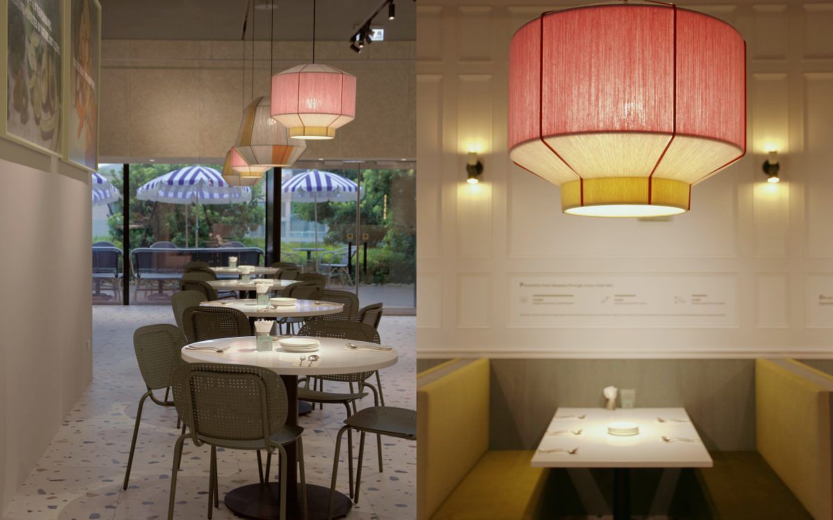小小樹食微風南山店的設計靈感來自周圍環境、當下和未來的人們,並以日常思維與行動來依循人文與創意為善的宗旨。從傳統斯佩特塞斯房屋的雙木門,到倫敦戶外飛地廣場Neal’s Yard,我們探索世界各地的小角落, 回憶中的顏色和珍貴發現。建材採用以稻殼、咖啡渣、成衣廢料及海洋廢棄物等再生材質製成的再生布纖板、屬於環保型綠色建材的木絲水泥板,原料取自天然礦物的新型環保塗料-礦物塗料,揮發性有機化合物(VOCs)和甲醛含量極低,對人體健康與環境更友善。餐椅則選用來自義大利品牌S.CAB Design最新永續材料製成的高品質系列家具,秉持對土地做更多事的永續經營理念與小小樹食相符,從小物件的選擇來體現我們對於環境的重視。