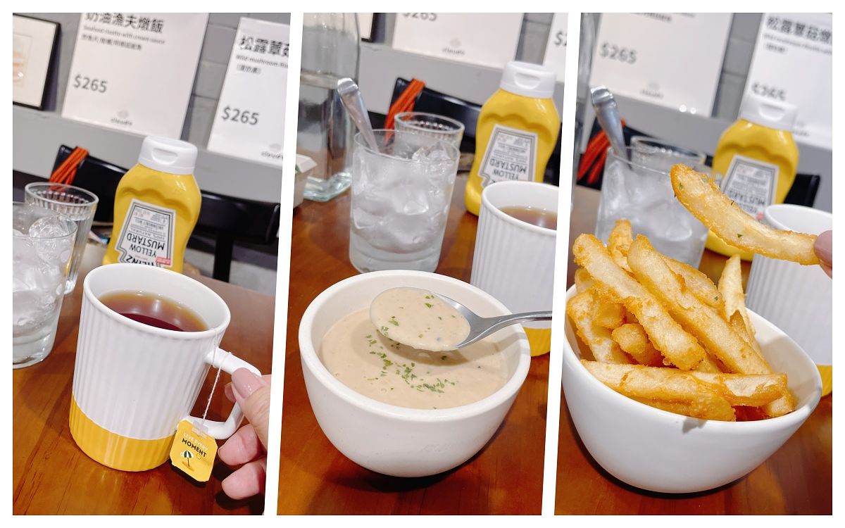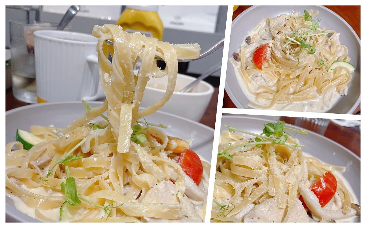 這邊每天14:00前的商業午餐最受歡迎,只要NT269,小缺點是~只有3種義大利麵可選擇,但剛好有我想吃的。附餐開胃菜可選沙拉、脆薯(地瓜薯條)、主廚例湯,今天是蘑菇湯,非常濃非常好喝!飲料有紅茶、美式、柚香茶。