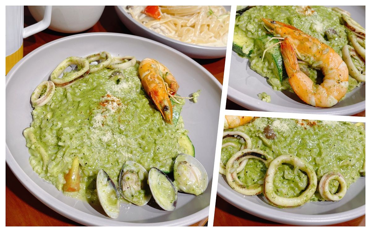 朋友很推這裡的燉飯,說這裡的燉飯可以吃到米心,所以這次點了「羅勒海鮮燉飯」,配料有阿根廷魷魚、白蝦、蛤蜊及鴻喜菇,很基本的作法但就是好吃!