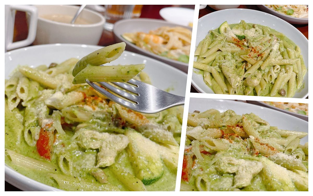 另一位朋友點的也是商業午餐的「羅勒蒜香雞肉」,一樣有吃不完的雞肉片,蔬菜一樣也是番茄及櫛瓜,很怕被湯汁噴到衣服的人,吃筆管麵很安全,喜歡麵食咬勁的人也會愛。