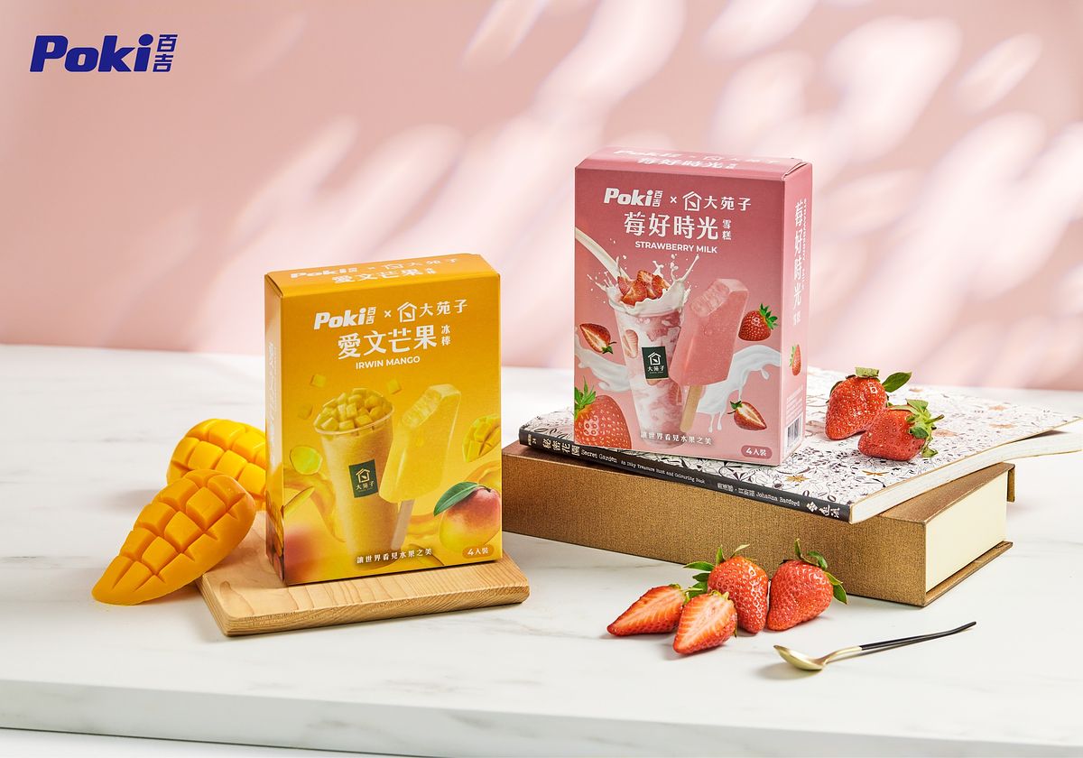 Poki百吉與大苑子聯名的「愛文芒果冰棒」、「莓好時光雪糕」為全聯獨家販售;與CoCo合作推出的「奶茶三兄弟雪糕」與「葡萄柚果粒茶冰棒」則會於全家、全聯、家樂福、大潤發等店鋪上架。歡迎消費者至各大通路體驗Poki百吉話題新品,為即將到來的夏日補給滿滿冰品應援能量。