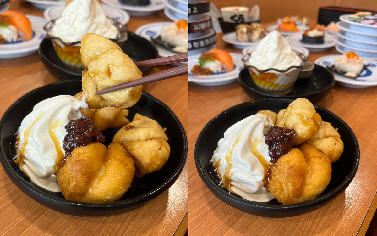 這款算是編輯每去必點的品項!油炸得金黃外酥內軟的甜甜圈,搭配冰淇淋一口吃下去根本超滿足。如果是螞蟻人,那就更要搭配著香甜綿密的紅豆一起送入口中,讓層次感更上一層樓!甜甜圈就算單吃也不無聊,很有咬勁且不油膩,下次去藏壽司記得留個甜點胃給這道!