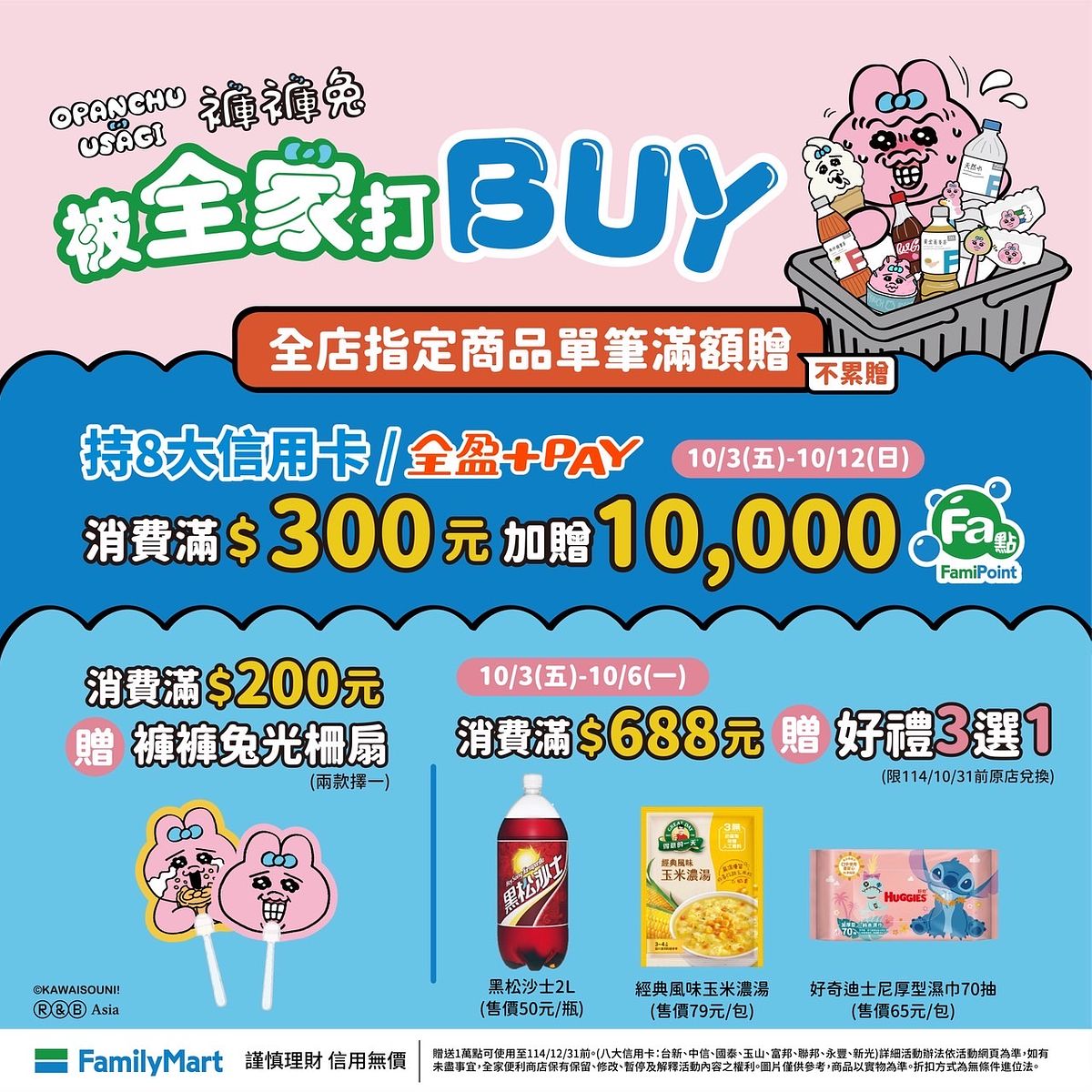 假期聰明消費,精打細算很 Easy!10 月 3 日至 10 月 6 日,單筆滿 200 元即贈榮獲日本角色大賞的日本可愛 IP 褲褲兔周邊小物「褲褲兔光柵扇」,10 月 10 日至 10 月 12 日同樣滿額 200 元則可獲得「褲褲兔紙膠帶」,替假期增添療癒收藏感;並加碼推出滿 688 元「好禮三選一」活動,從白蘭氏雞精飲品、好奇迪士尼厚型濕巾、黑松沙士 2L、舒潔衛生紙到盛香珍小魚乾花等實用選項,消費者可依需求自由挑選,實際減輕日常開銷。10 月 3 日至 10 月 12 日,更祭出滿額贈點回饋活動,使用全盈+PAY 或指定信用卡消費滿 300 元,即可享 1 萬 Fa點回饋,讓日常購物不僅當下省,更能化為未來消費的籌碼。