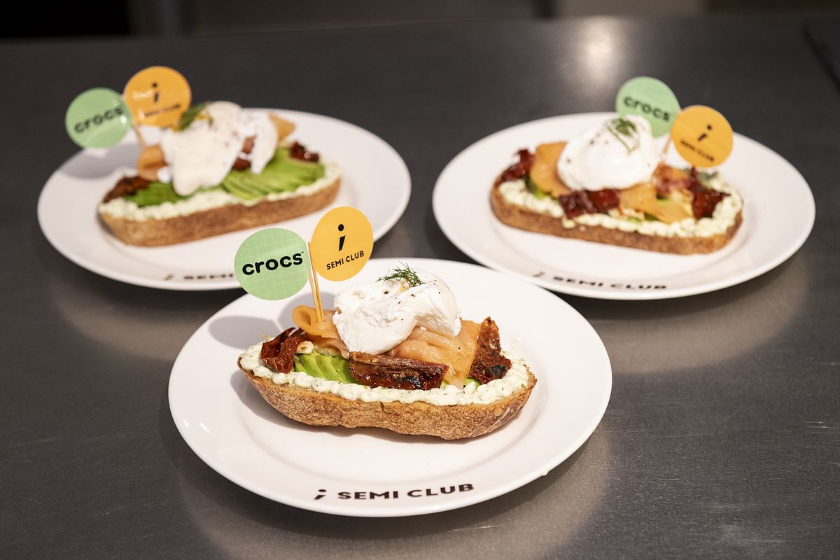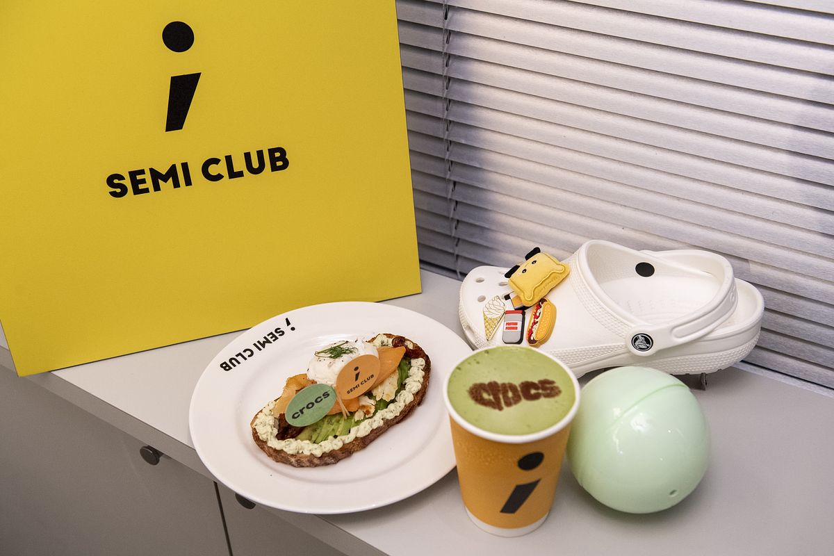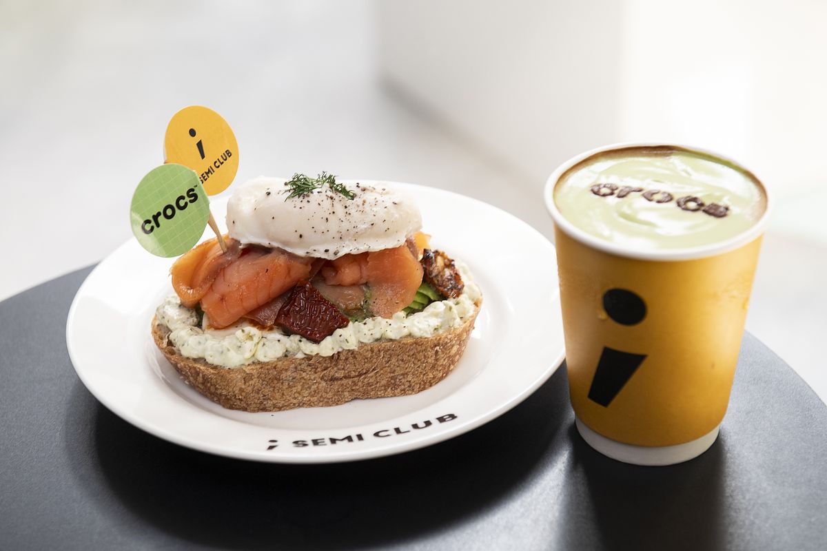 以 Crocs 為發想概念的限定餐點「燻鮭酪梨開放式三明治」,使用 SEMI CLUB 招牌的天然酵母發酵的酸種麵包,手工麵包散發獨特酸香,氣孔自然分布,如同 Crocs 鞋款傳遞的自由與舒適感。麵包上堆疊鮮綠酪梨片,呼應品牌代表色;煙燻鮭魚與鹹香 Halloumi 起司交融,加上水波蛋、番茄與蒔蘿點綴,如 Crocs 鞋上的 Jibbitz™ 鞋扣,兼具實用與玩心。飲品「抹茶椰香咖啡」同樣創意十足。以椰子水為基底,結合 espresso 的柑橘與堅果香氣,再覆上抹茶奶蓋,傳遞Crocs 樂觀、活潑的品牌個性。層次分明的風味,就像 Crocs 鞋款,兼具風格與功能。凡購買 Croctober 限定餐點,即可獲得代幣參加主題夾娃娃機活動,有機會贏得 Jibbitz 鞋扣、專屬折扣券等豐富好禮。店內更設置 Crocs 超大洞洞鞋裝置與其他拍照打卡體驗,邀請粉絲在享用美食的同時,也能感受 Croctober 帶來的驚喜氛圍。