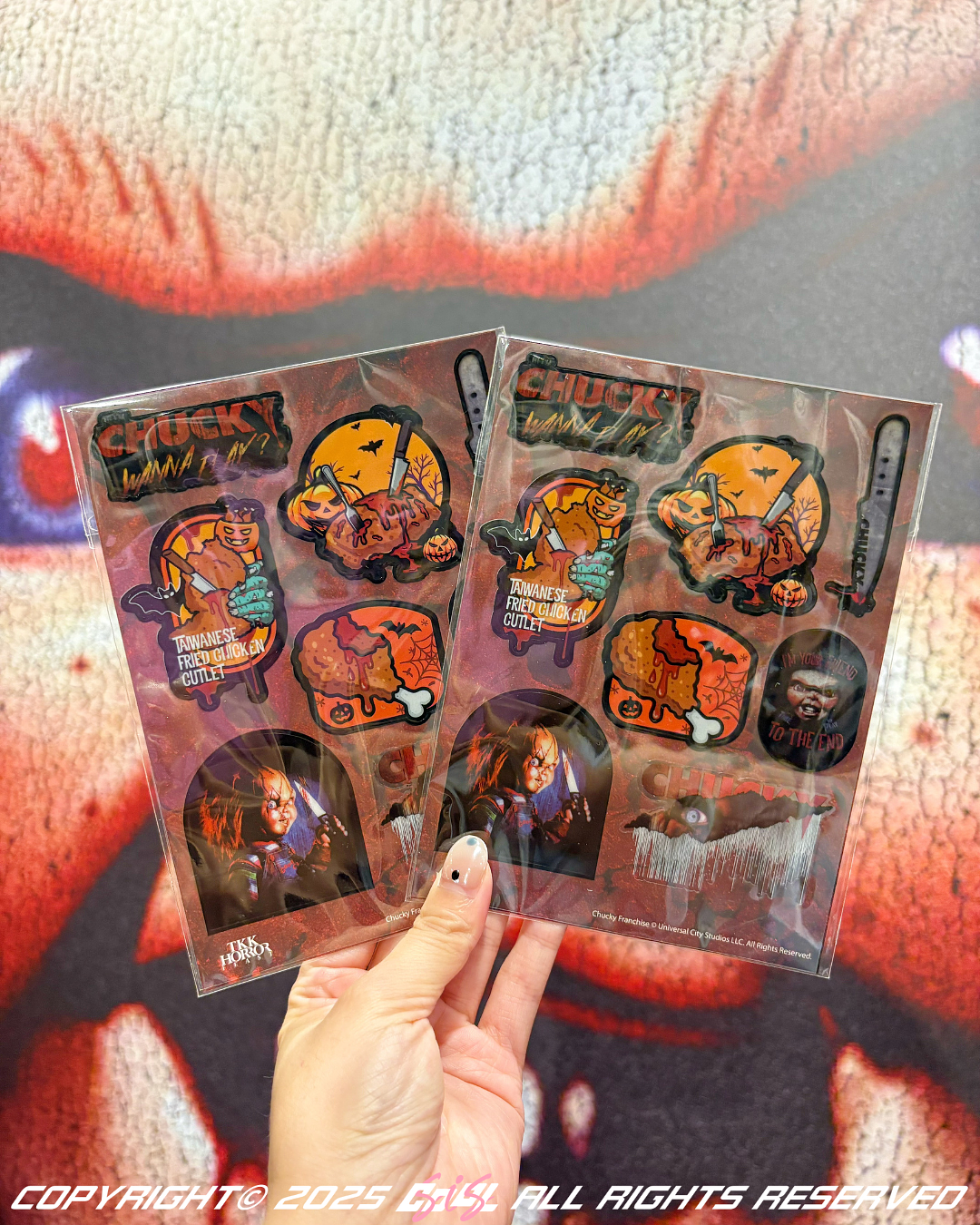 頂呱呱將全系列包裝換上《鬼娃恰吉》主題設計,黑紅配色搭配恰吉的瘋狂笑容與經典血色細節,從漢堡盒、紙袋、派對桶到飲料杯,每一樣都充滿「殺氣美學」,拿在手上就是焦點,拍照打卡絕對是今年萬聖節的最潮百搭!除了聯名餐點之外,其中最受矚目的「鬼娃恰吉發條玩具盲袋」共推出四款造型,每款可用399元直接購入。每一款恰吉的臉部表情、武器與背卡設計都不同,細節滿滿、極具收藏價值,開袋瞬間宛如被惡作劇般驚喜,絕對是今年萬聖節最具話題的玩具!而同時登場的「鬼娃恰吉萬聖節造型貼紙」則以鬼娃恰吉經典動作與血紅字體設計為主題,每張直購價89元,或單筆滿299元即可免費獲贈乙張(可累贈),讓你的筆電、手機殼或牆面都充滿節慶驚悚氛圍!