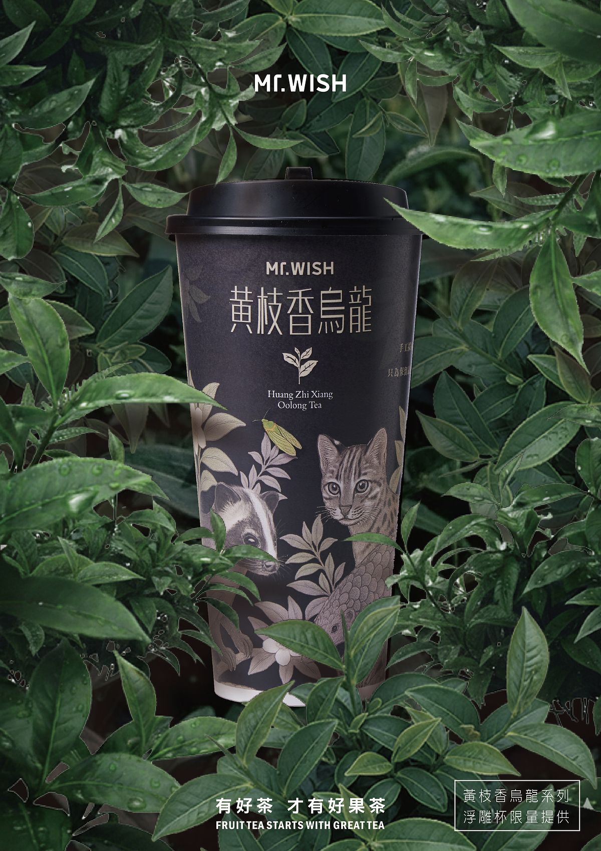 黃枝香烏龍系列飲品專屬浮雕杯,用好茶延續守護生態的精神。象徵茶葉與自然共生的友善關係。黃枝香專屬的立體浮雕在手中留下觸感的記憶,也讓人意識到「好茶」不僅來自工藝,更源於對土地的尊重。為了邀請全民一起與Mr.WISH 透過「黃枝香烏龍」詮釋新的飲茶方式——讓香氣、質地與生態都回到純粹自然地節奏。