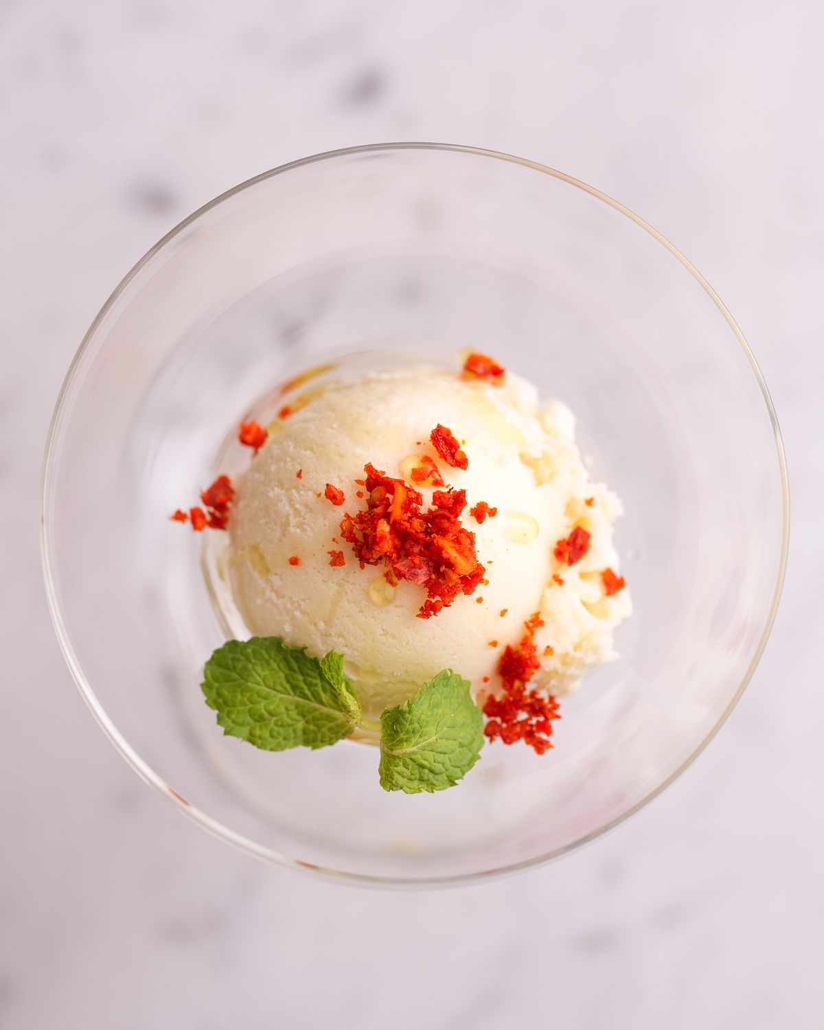 尾聲以豆香收尾最是合宜,自製豆腐冰淇淋細緻綿密,質地清爽卻不單薄,豆香濃郁,灑上快炒辣椒製成的脆椒、花生碎,佐一點藤椒油,麻香滋味反倒帶出宴席的尾韻起伏,簡單卻記憶深刻,這一口,不為濃烈,而是讓味蕾知曉:宴已至末,但香氣猶存。