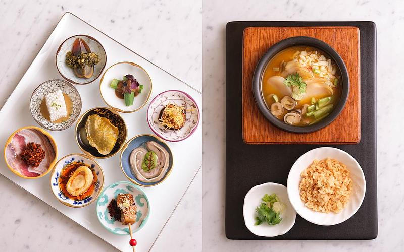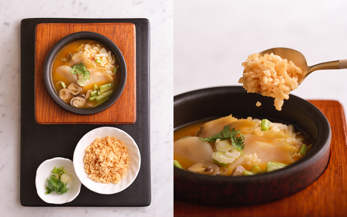 為了重現正統川味的精神脈絡,王國政主廚親赴四川,向松雲派張元富師傅學習經典菜式「元富魚翅羹」。從挑選食材到火候掌握,每一步皆親身實作、逐一拆解;而更珍貴的,是一道菜背後的歷程、心法與記憶,被細細傳授、毫無保留地交付。王師傅回台後,將這份味道反覆復刻、調整、打磨,讓這道菜不只是再現,而是在川雅脈絡中重新演繹。它所承載的,不只是味道,更是川菜世代傳承的精神與技藝。延續這份傳承,王師傅以「酸湯蟹肉泡脆米」展現,將自製泡菜、番茄與豆瓣炒香後注入豬骨高湯,煮成酸鮮澄亮的川味酸湯,搭配鮑魚、蟹肉、貢菜與草菇等豐富配料,並附上蒸煮後炸至金黃的脆米,入口軟潤酥香,湯韻綿延,是王師傅將師徒記憶轉化為當代新作的精彩詮釋。