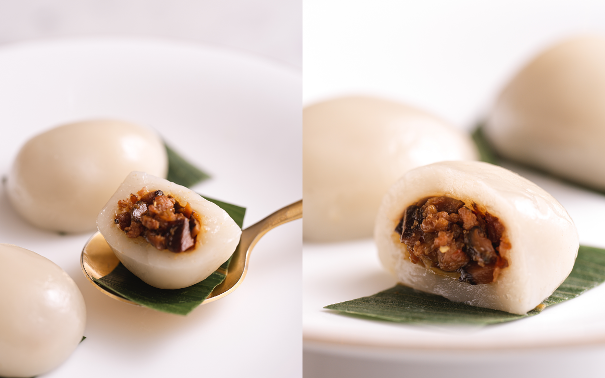 川菜講究節奏拿捏,「中點」正是串聯筵席中的留白設計。葉兒粑是四川常見的傳統點心,外皮以糯米粉製成,柔韌滑糯,內餡有甜有鹹,筵席與日常皆宜。川雅本次以鹹餡版本詮釋,將宜賓芽菜、泡椒、蝦米、豬肉末、香菇等炒製餡料,帶有鹹香、微辣與回甘,包入手工糯米皮後,以竹葉襯底蒸製,葉香滲入,餡香飽滿,米香細膩,入口柔軟不膩,恰到好處地銜接下一道菜的節奏。