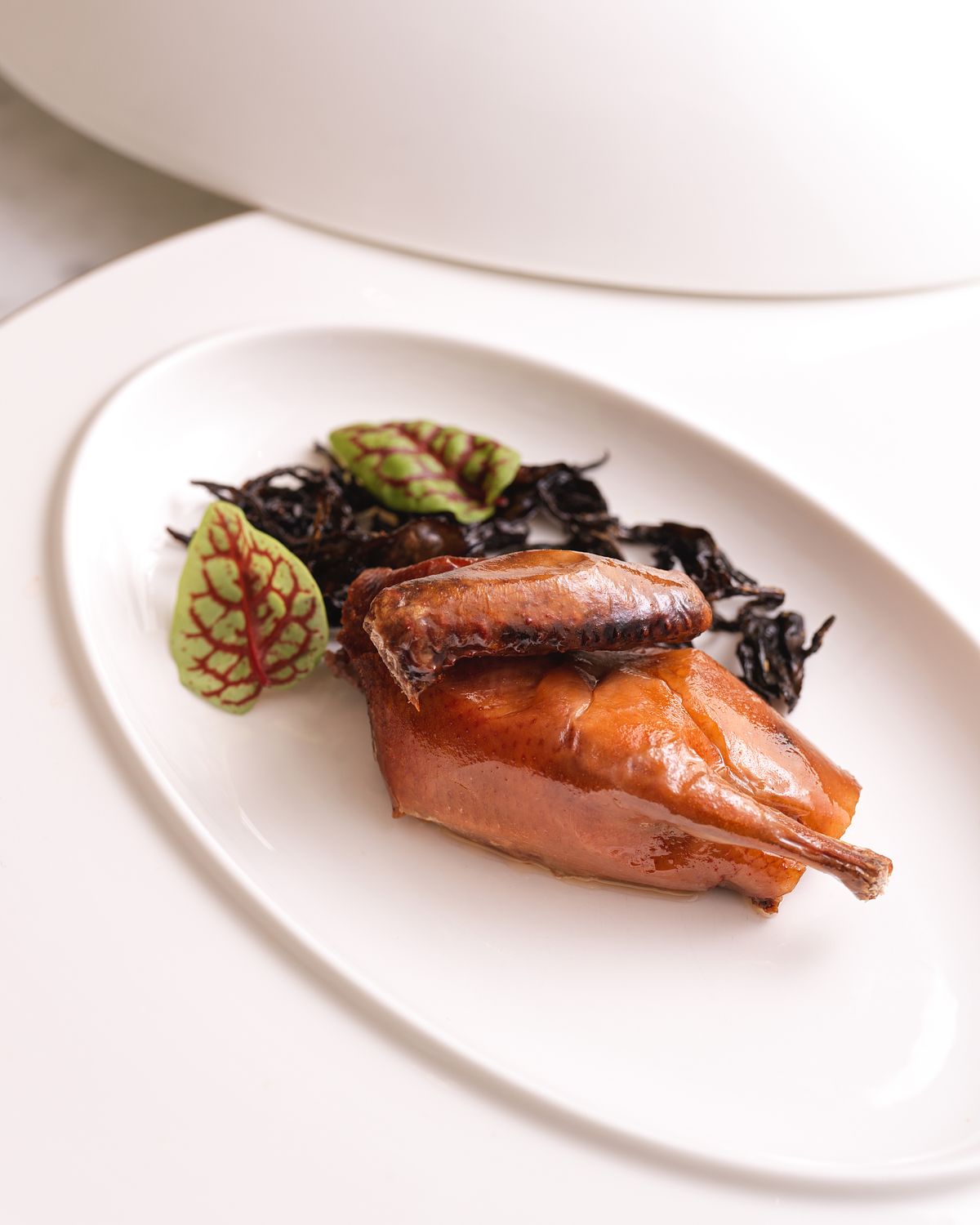 在傳統川菜筵席的「四柱」架構中,主廚王國政承襲傳統卻不受其限,以乳鴿入菜,為柱菜添上一筆意想不到的精彩。嚴選來自屏東、養殖僅二十二天的初生乳鴿,體型輕巧、骨細肉嫩。製作前先將乳鴿浸入以花蓮舞鶴紅茶為基底,融合香料與水果調製的白滷水中一夜入味,滷後燙皮、刷醋水、風乾兩小時,再於表皮反覆刷上三層自製脆皮糊,最後以小火慢炸至皮薄如瓷、酥脆如響,卻不掩其內裡的鮮嫩多汁。上桌前輕噴舞鶴紅茶茶油,茶香微微散開,入口再佐以炸過的紅茶葉,蜜香與果香交織,與鴿肉的鮮、皮脂的酥、茶氣的清雅彼此襯映,餘香不絕。
