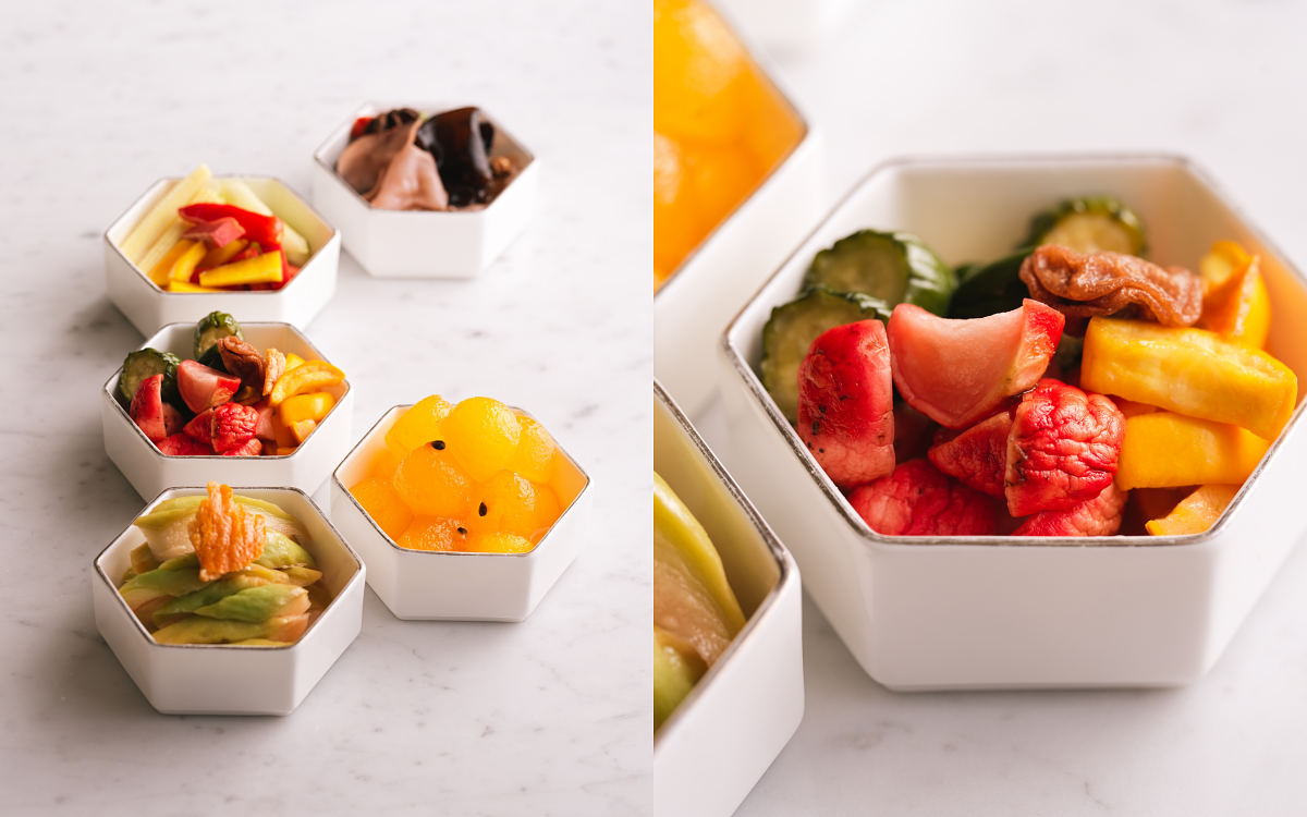 在川菜中,泡菜不僅是家常滋味,更是川人餐桌上一道「未食先動心」的風味序章。主廚王國政以短時醃製的「跳水泡菜」為靈感,轉化為一道自製「手藏泡菜」,開席未啟,味已入心。風味依序展現泡菜的廣度與深度,鋪陳出川味24味型的餘韻,首款為甜酸回甘的糖醋與陳皮味型,選用大黃瓜、佛手瓜與萵筍為基底,調以糖與醋,佐以陳皮帶出柑橘果香,清新爽口;第二款為酸香爽脆的泡椒味型,風格近似四川家常「熊貓泡菜」,以黃甜椒、玉米筍、胡蘿蔔與小黃瓜組合,色澤繽紛;第三款構築層層辛香,選以白玉木耳與小川耳,搭配八角、山奈、紅花椒與草果,辛香沉穩;最後一味為酸辣味型,選用冬瓜球醃入特調黃辣椒,再添百香果增添果香,清脆鮮甜中,尾韻輕辣,是餘味的一記記號。每一款皆有其性格,從柔和至強烈、從清新至辛香,層層遞進,為整桌川味立下深刻而鮮明的風味基調。