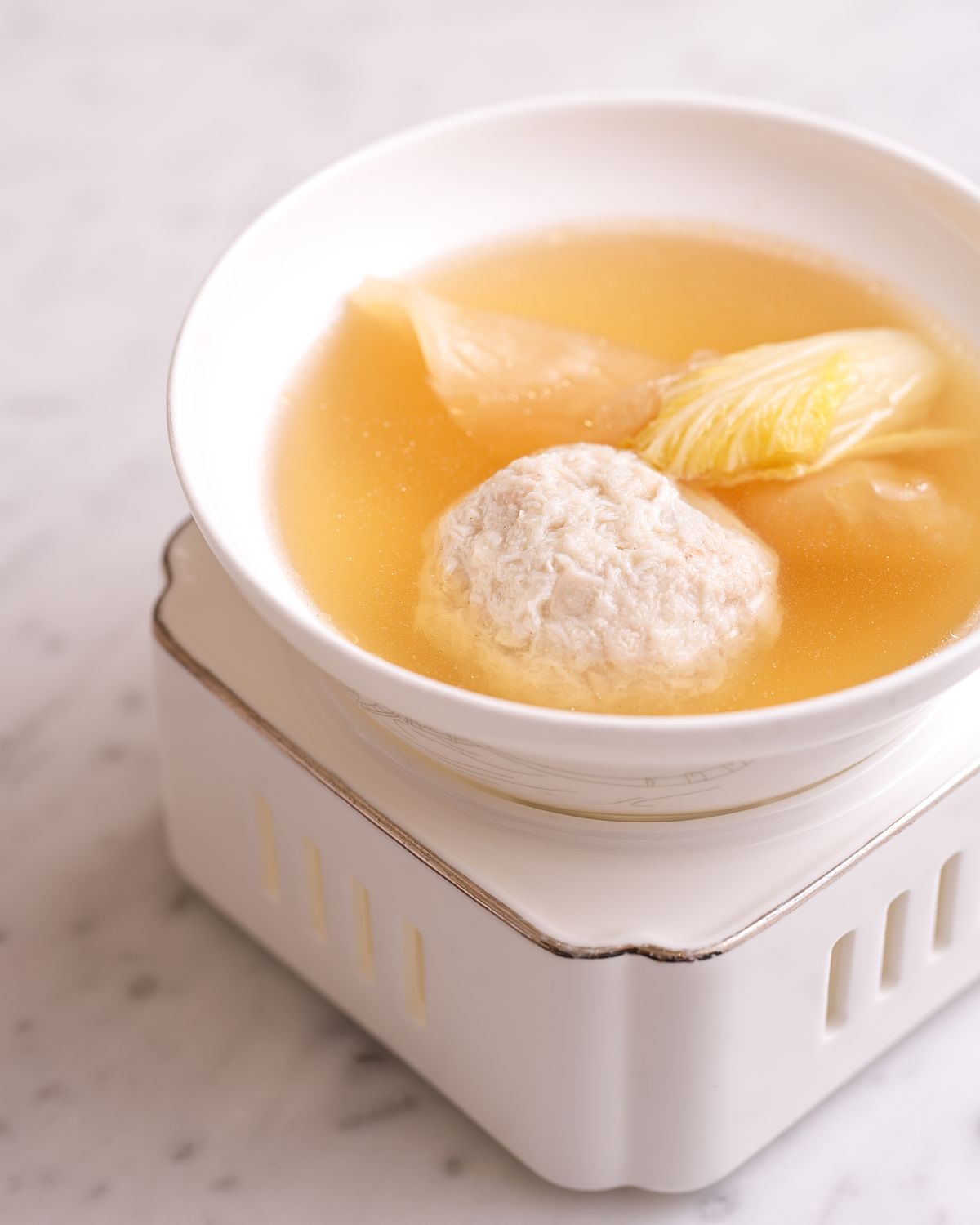 一碗好湯,是澄澈見底、味足氣練。此道獅子頭取法揚州經典「葵花斬肉」與川菜傳統「苕菜獅子頭」,主廚揉合豬五花、雞腿肉、蝦仁、香菇與鮮筍細工搗泥,反覆摔打至具彈性與黏性,再拌入藍花蟹肉蒸熟定型,入口柔韌、鬆而不散。獅子頭與清湯共煨,湯底以老母雞、金華火腿、豬骨慢燉八小時,再三次以鴨蓉、豬蓉、雞蓉掃湯澄清,保留濃郁滋味之餘,湯色清亮透白,湯香撫舌,肉香回繞,喝上一口便回神。