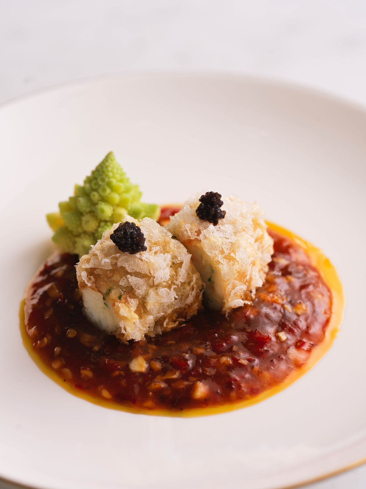 以川式醃漬海味為基礎,圓鱈裹漿酥炸,佐茉莉花香的照燒風味醬,綴以春捲皮脆片,入口前就能聞到其獨特香氣。
