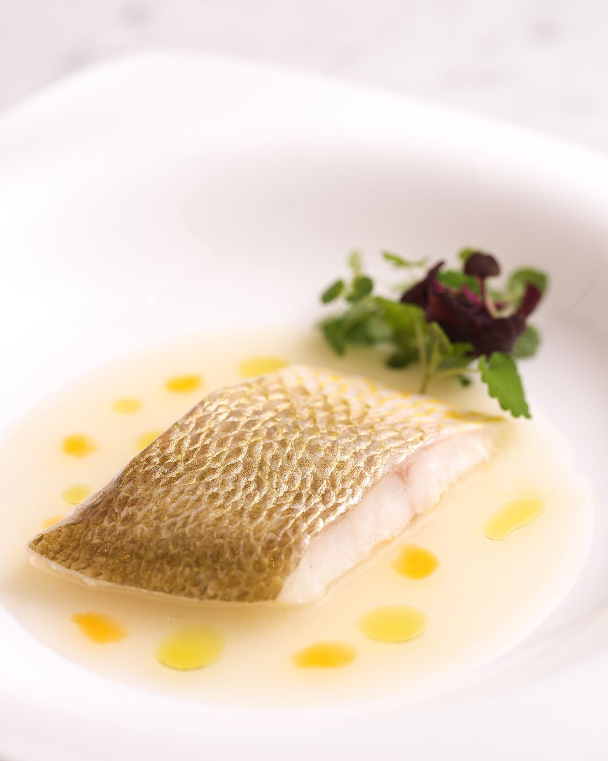 川菜講究香氣鋪陳與味型堆疊,無論麻辣或清香,各有其獨特風味。而藿香風味的運用是一道獨特支線,不靠厚重辛香,有著草本清香,在大火熱油之間仍能留住鮮明香氣。川人習慣在料理魚菜餚時加入藿香,既能增添獨特香氣,也有助去除腥味;而傳統的藿香黃花魚,以草魚、黃花、豆瓣、藿香組合,既是家常,也是代表作之一。主廚延續這份經典,換上更細緻的展現,選用肉質細嫩的黃花魚,以低溫慢煮保留鮮甜,以大葉、紫蘇、薄荷與茱萸提煉藿香氣韻,並加入花椒製成帶有海味的醬汁,綴以自製辣椒油、木薑子油與茱萸油提香,入口時,藿香先至,魚肉鮮香隨之而來,香而不膩,清而有致。