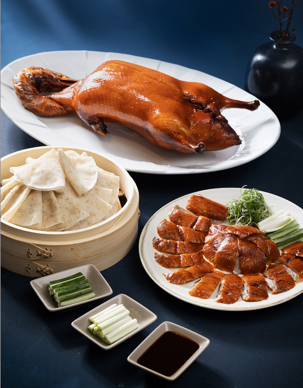 經典片皮烤鴨,嚴選三公斤熟成櫻桃鴨,將鴨皮烤至口感「酥脆香滑」外皮呈現金紅色的油亮色澤,肉質鮮嫩多汁。搭配手工蕎麥潤餅,靈魂蘸醬則加入金棗乾慢火熬煮提味出清爽解膩的口感,讓你每一口都能體驗到層次上的不同口感與傳統和創新的完美融合。