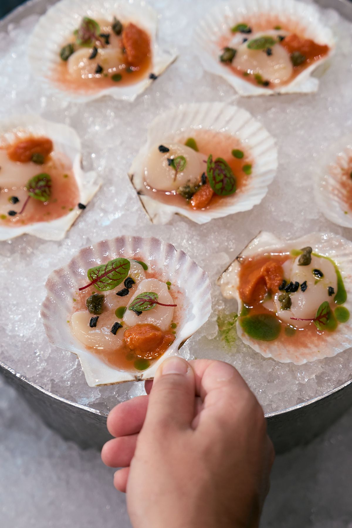 以低溫手法烹調北海道扇貝,保留細膩鮮甜與海洋旨味。澄清番茄湯經24小時精煉,凝聚果香與酸度的純粹平衡。最後以酥炸酸豆與黑橄欖點綴,如浪花輕拍般襯托扇貝的鮮嫩柔軟,呈現細緻而內斂的地中海節奏。