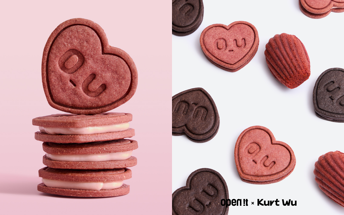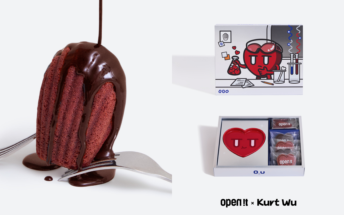 今年聖誕節,open it. 推出全新創作「Sugar Formula 甜蜜公式」聖誕聯名禮盒,首度攜手知名插畫藝術家 Kurt Wu,以他筆下極具辨識度的「厭世愛心」角色為靈感,讓味覺與心情交織,期望每個人都能透過自己的「實驗」,找出屬於幸福的甜蜜公式。聖誕限定風味「紅絲絨瑪德蓮」,以及以 Kurt Wu 經典愛心角色打造的「草莓雲朵夾心」與「黑巧雲朵夾心」。三款限定點心:「紅絲絨瑪德蓮」結合巧克力甘納許與奶油乳酪的經典搭配,質地鬆軟細膩,展現法式甜點的優雅層次。「草莓雲朵夾心」以愛心造型 呈現,外層酥脆、內餡柔滑,草莓顆粒果香在口中綻放,是冬日最柔軟的幸福滋味。「黑巧雲朵夾心」融合嘉麗寶 70%巧克力、法芙娜可可粉與比利時牛奶巧克力,打造滑順濃郁的苦甜口感,演繹最經典的幸福配方。