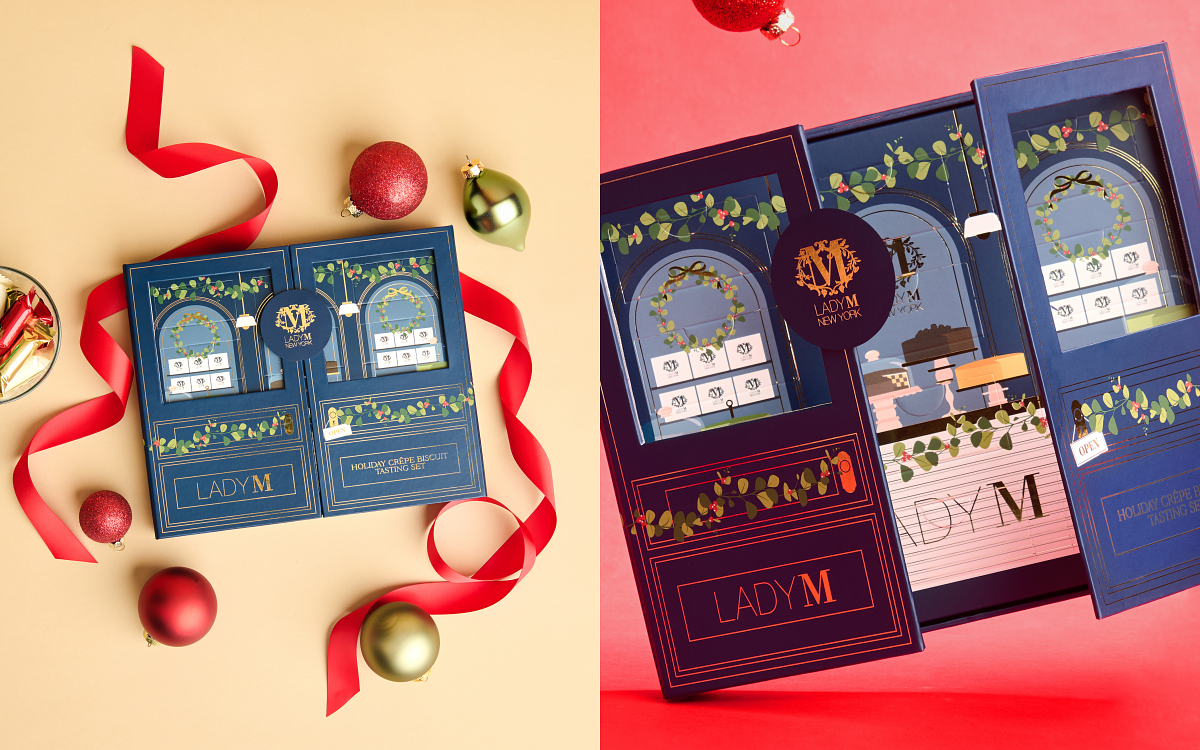 LADY M 2025 聖誕可麗捲餅禮盒,精選12入迷你可麗捲餅,包含香草、榛果巧克力、伯爵茶與抹茶四款經典風味,每款各三入。每一口都酥脆香濃、柔滑細緻,為節日時光添上幸福甜意。禮盒以深藍與香檳金為主調,延續 LADY M 的法式美學;並附上精緻提袋與可書寫祝福的專屬區域,完美呈現贈禮品味。